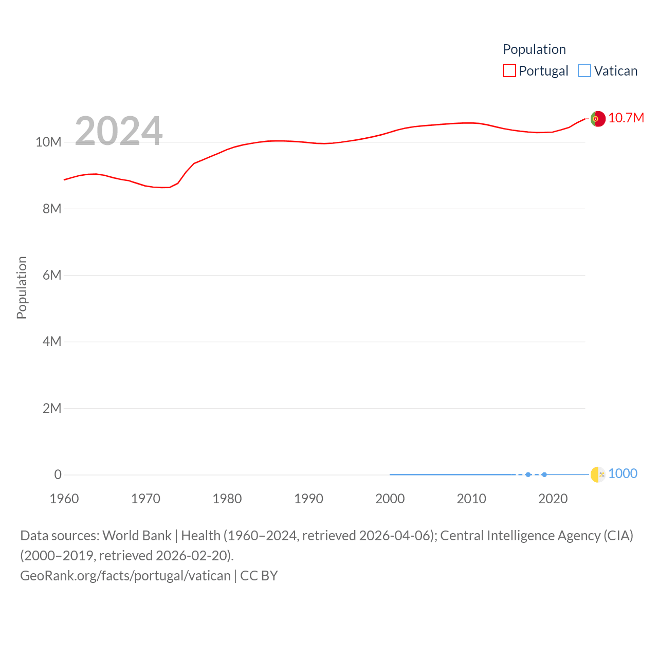 Portugal has a population of 10.7M (ranked 90/197), compared with 1K in The Vatican (ranked 197/197). Portugal's land area is 35,369 sq mi versus 0.17 sq mi for The Vatican (ranked 108th vs. 197th).