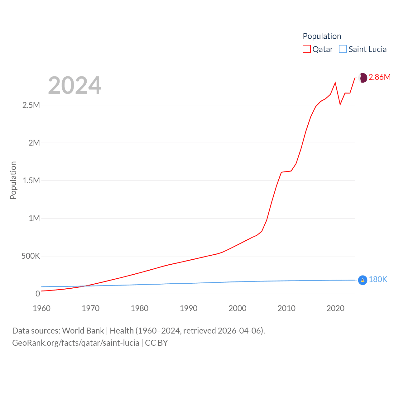 Qatar has a population of 2.86M (ranked 138/197), compared with 180K in Saint Lucia (ranked 178/197). Qatar's land area is 4,436 sq mi versus 235.5 sq mi for Saint Lucia (ranked 158th vs. 178th).