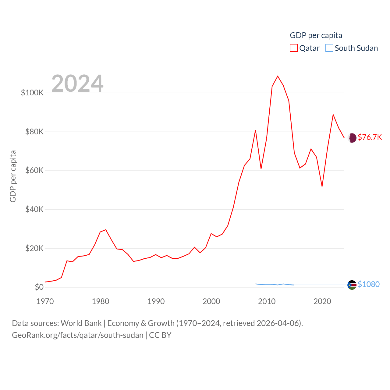 By GDP, Qatar ranks 56/197 ($219B) and South Sudan ranks 149/197 ($12B). By GDP per capita, Qatar ranks 11/197 ($76,689), while South Sudan ranks 175/197 ($1,080).