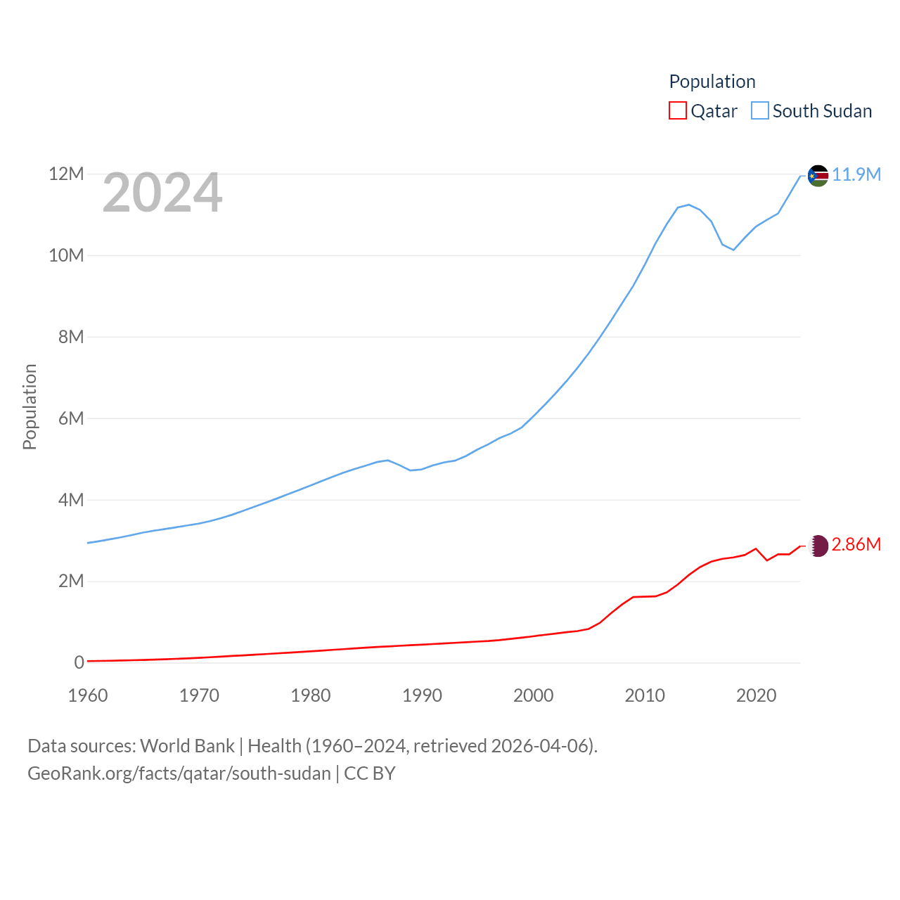 Qatar has a population of 2.86M (ranked 138/197), compared with 11.9M in South Sudan (ranked 81/197). Qatar's land area is 4,436 sq mi versus 243,990 sq mi for South Sudan (ranked 158th vs. 41st).