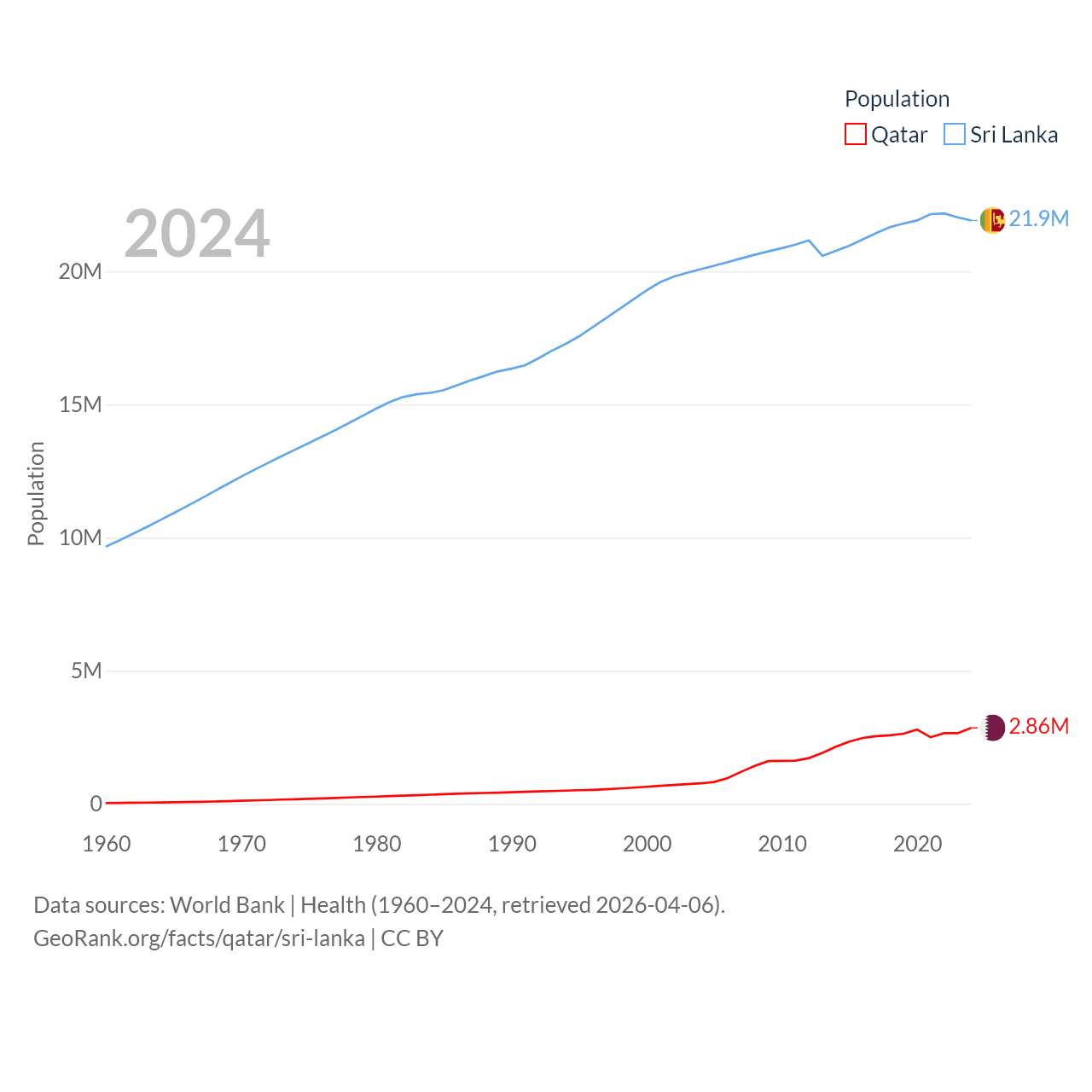 Qatar has a population of 2.86M (ranked 138/197), compared with 21.9M in Sri Lanka (ranked 61/197). Qatar's land area is 4,436 sq mi versus 23,884 sq mi for Sri Lanka (ranked 158th vs. 122nd).