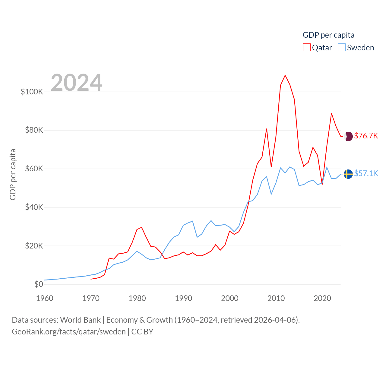 By GDP, Qatar ranks 56/197 ($219B) and Sweden ranks 26/197 ($604B). By GDP per capita, Qatar ranks 11/197 ($76,689), while Sweden ranks 17/197 ($57,117).