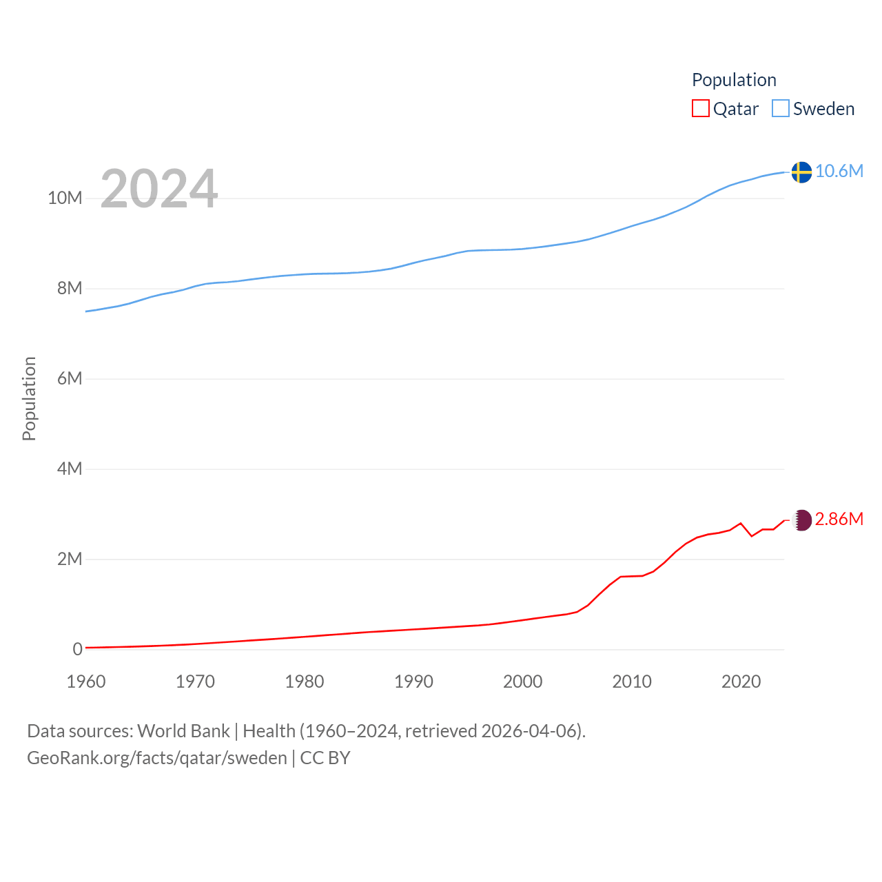 Qatar has a population of 2.86M (ranked 138/197), compared with 10.6M in Sweden (ranked 93/197). Qatar's land area is 4,436 sq mi versus 157,248 sq mi for Sweden (ranked 158th vs. 58th).