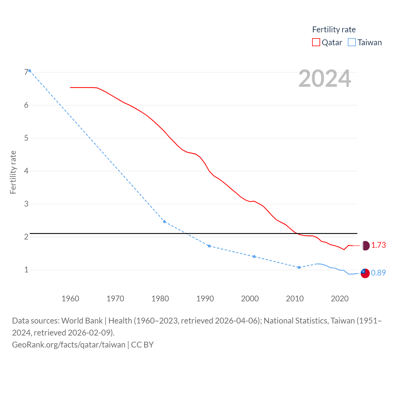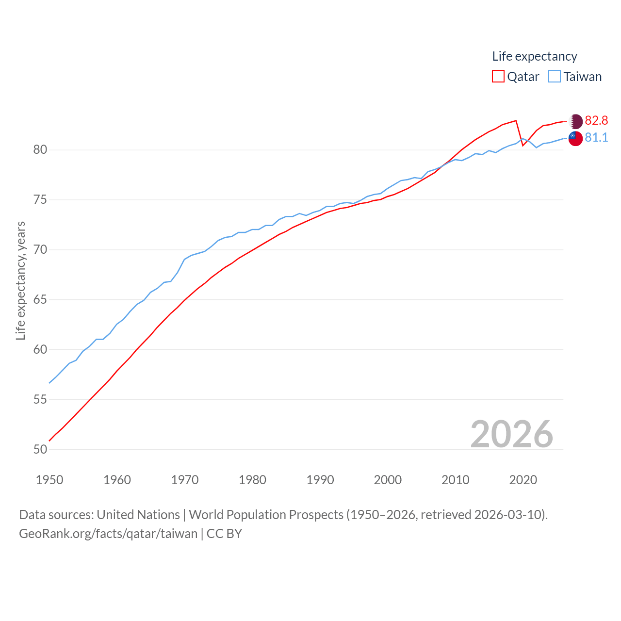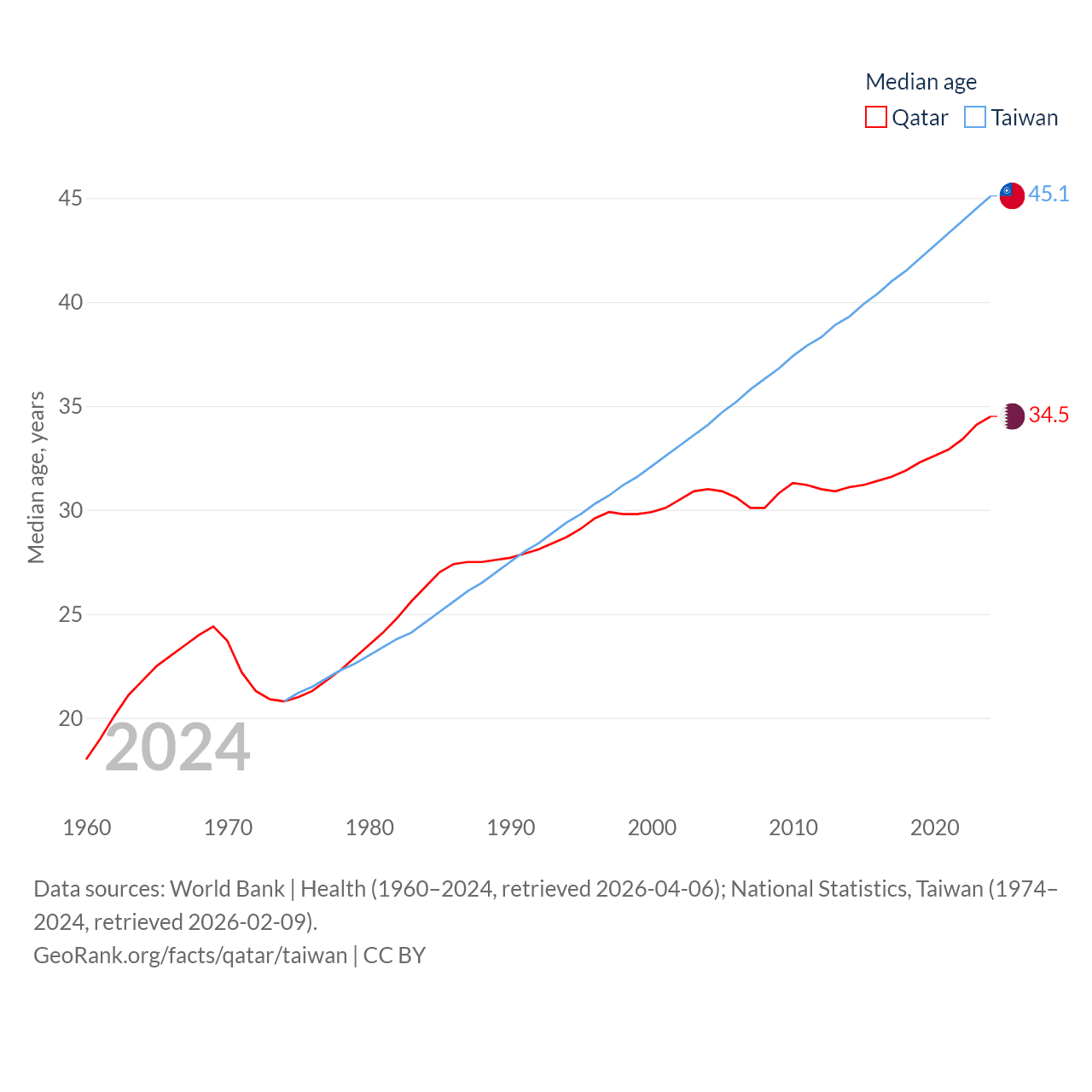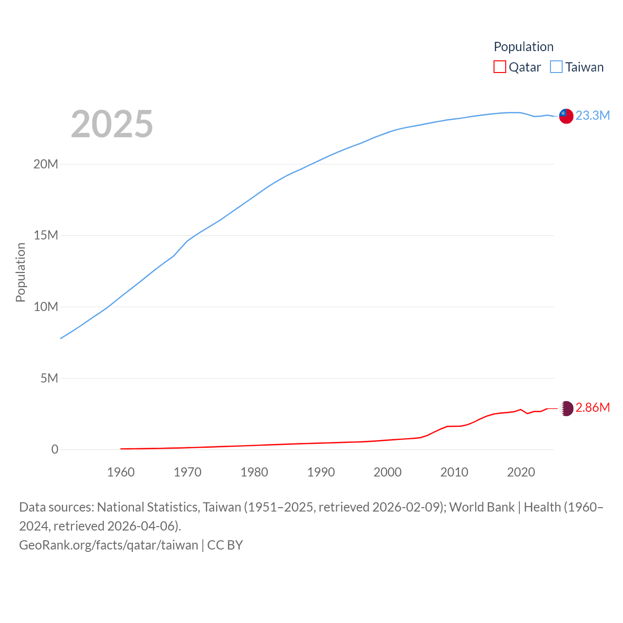 Qatar has a population of 2.86M (ranked 138/197), compared with 23.3M in Taiwan (ranked 60/197). Qatar's land area is 4,436 sq mi versus 13,976 sq mi for Taiwan (ranked 158th vs. 133rd).