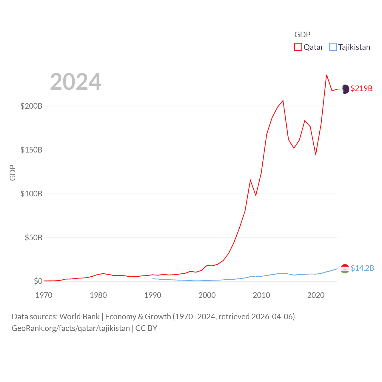 By GDP, Qatar ranks 56/197 ($219B) and Tajikistan ranks 145/197 ($14.2B). By GDP per capita, Qatar ranks 11/197 ($76,689), while Tajikistan ranks 166/197 ($1,341).