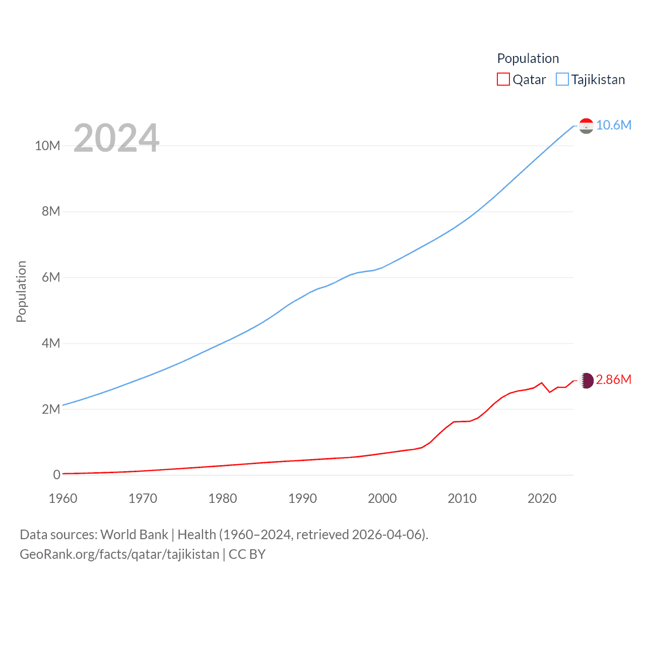 Qatar has a population of 2.86M (ranked 138/197), compared with 10.6M in Tajikistan (ranked 91/197). Qatar's land area is 4,436 sq mi versus 53,587 sq mi for Tajikistan (ranked 158th vs. 93rd).