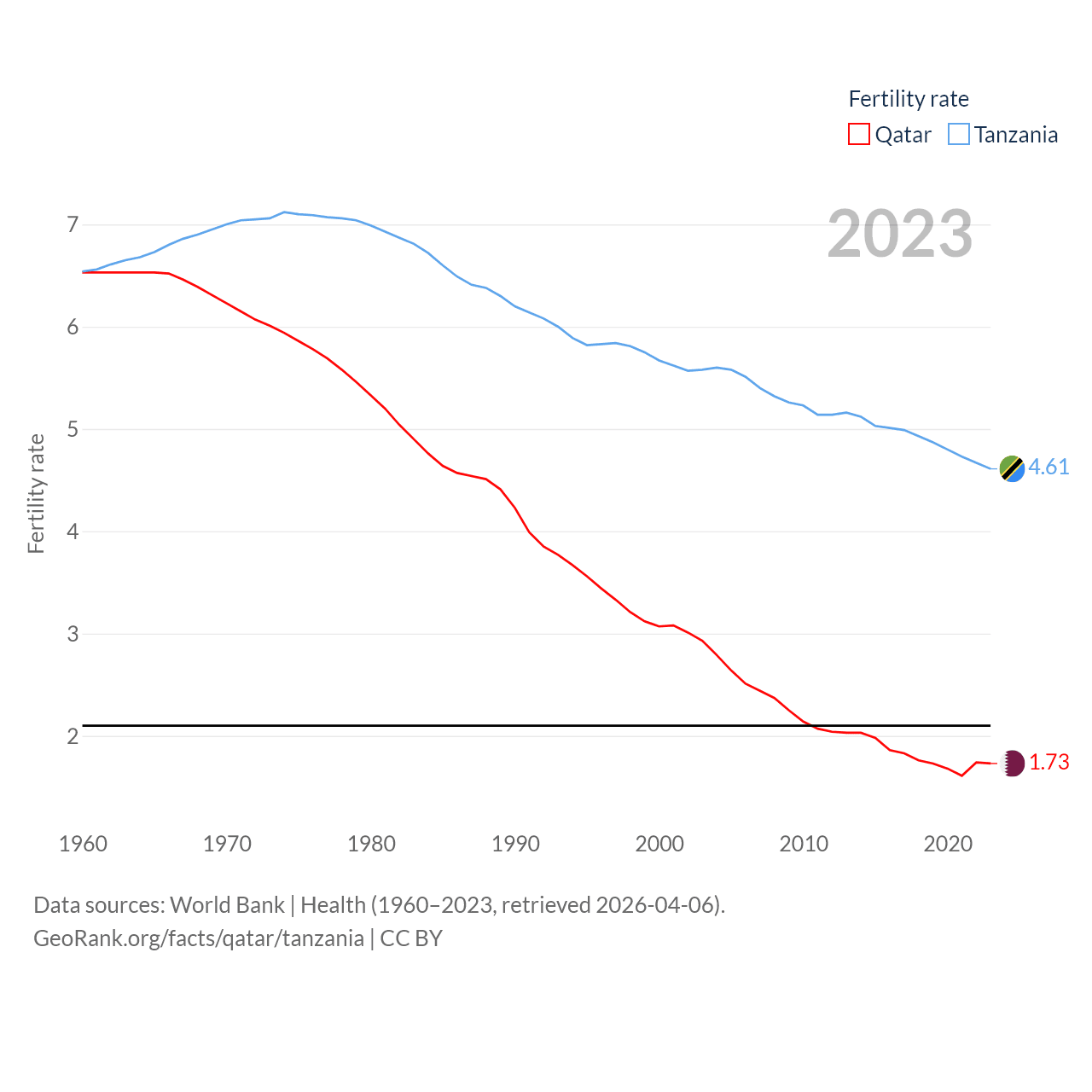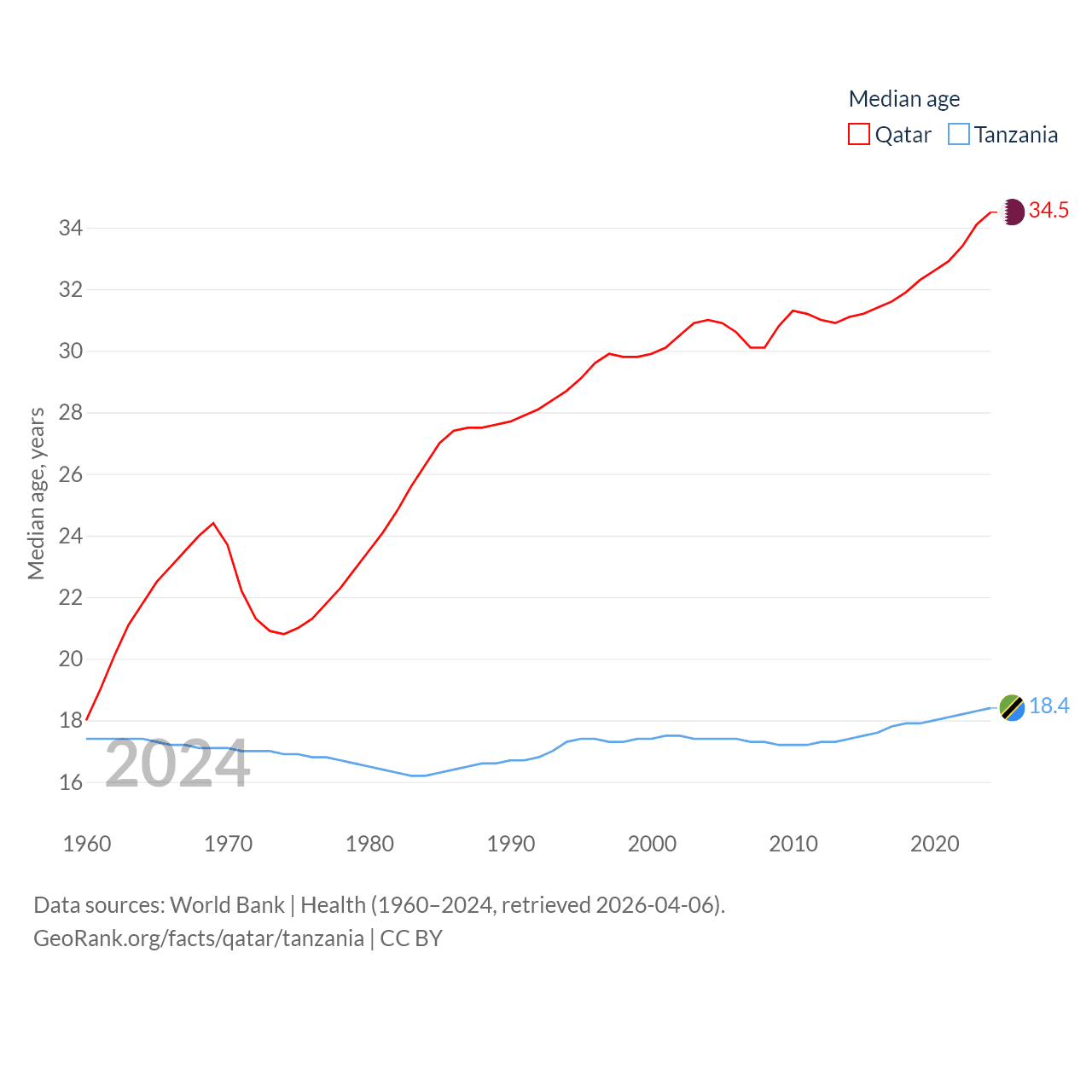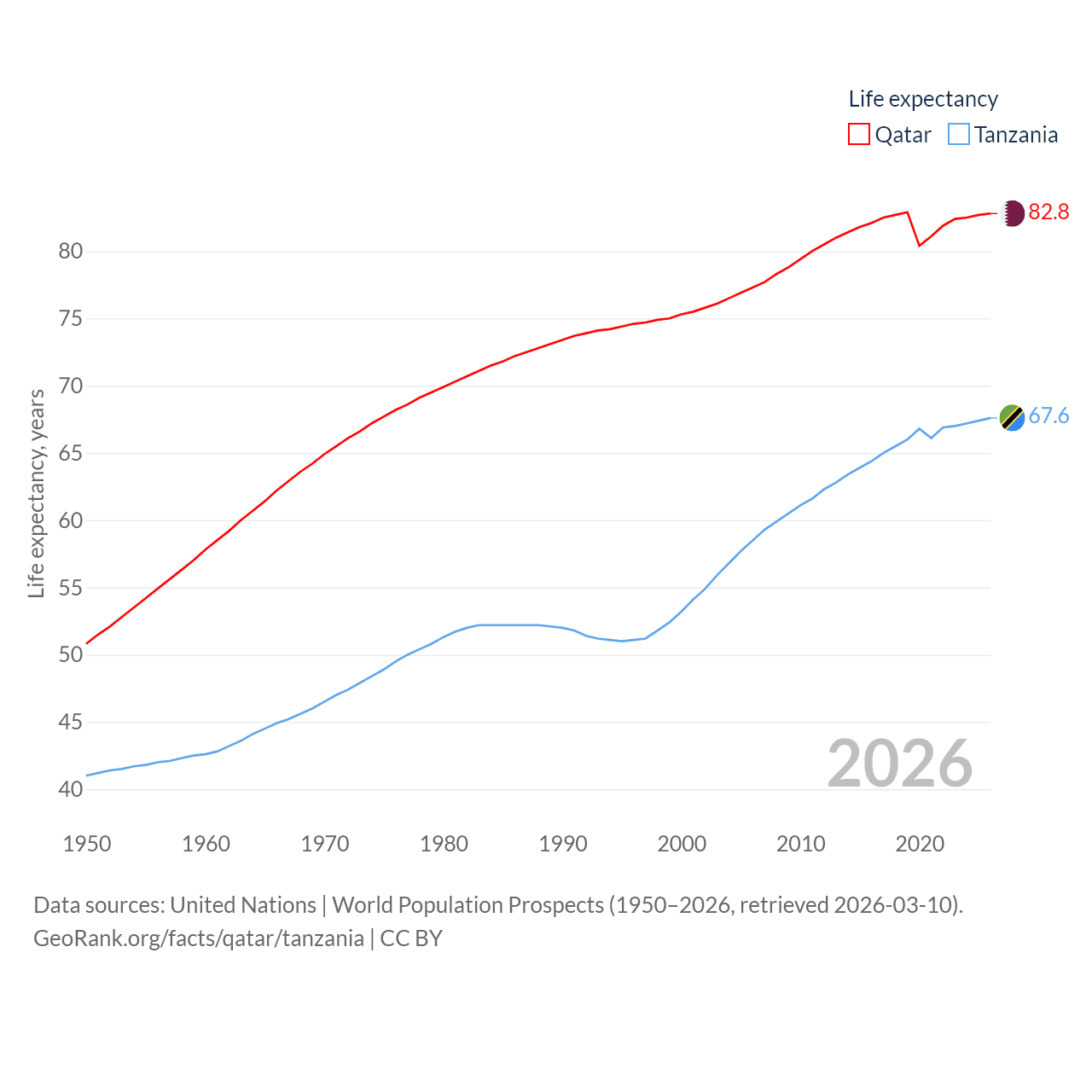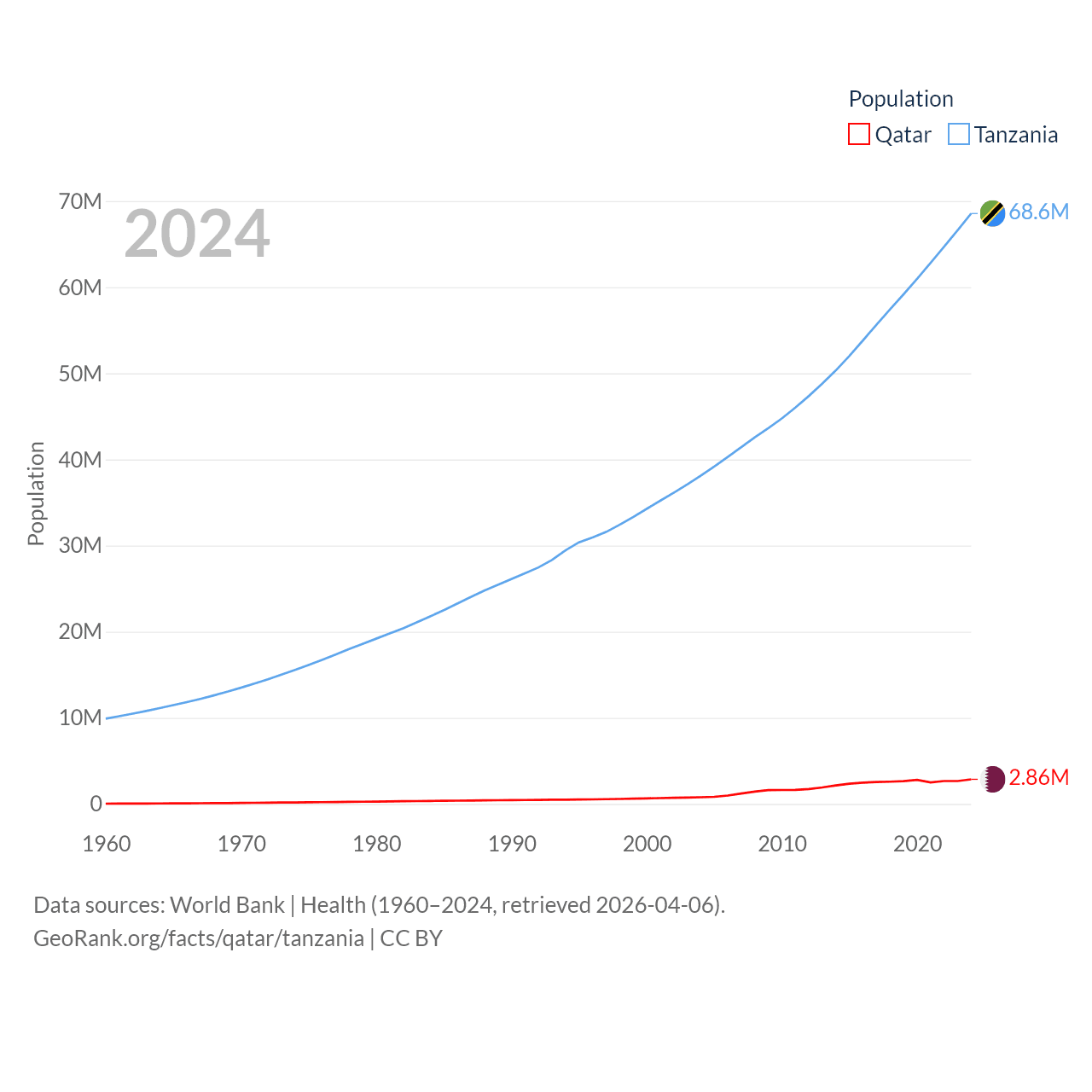 Qatar has a population of 2.86M (ranked 138/197), compared with 68.6M in Tanzania (ranked 22/197). Qatar's land area is 4,436 sq mi versus 342,009 sq mi for Tanzania (ranked 158th vs. 31st).