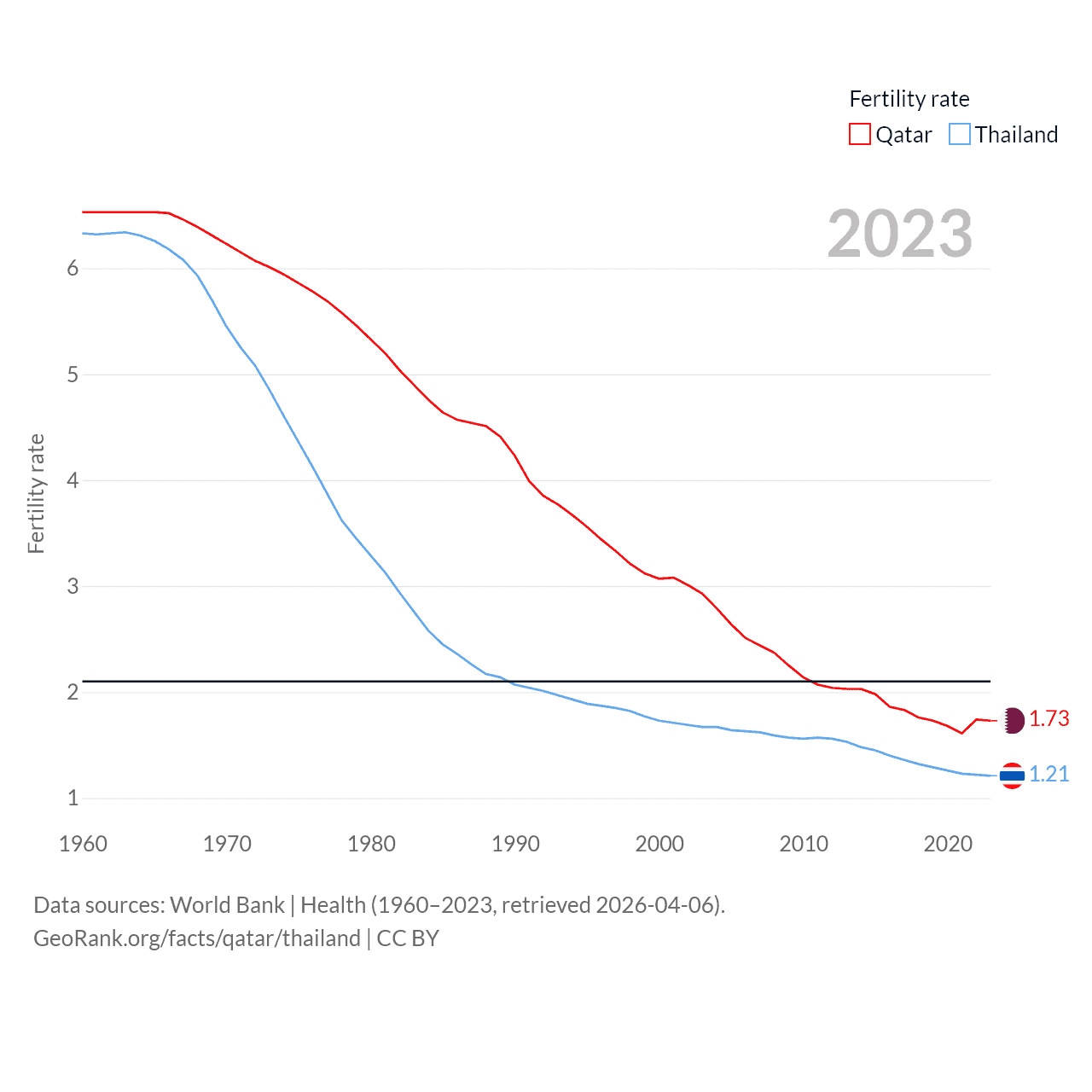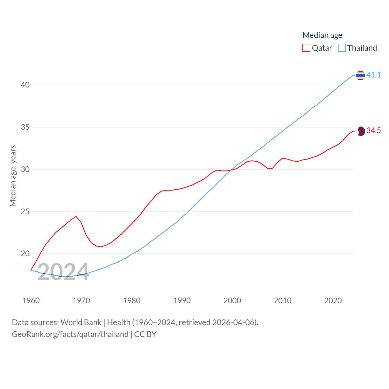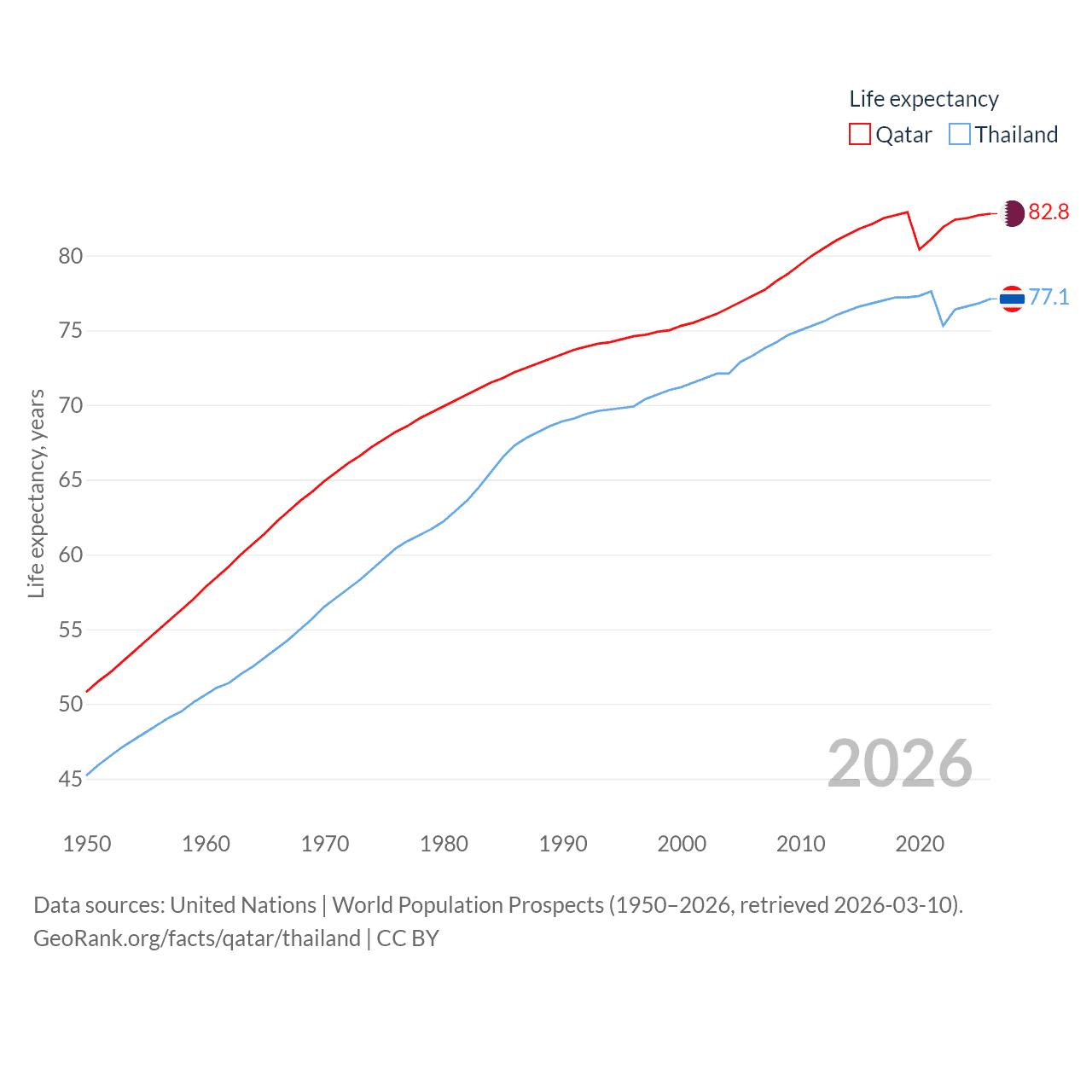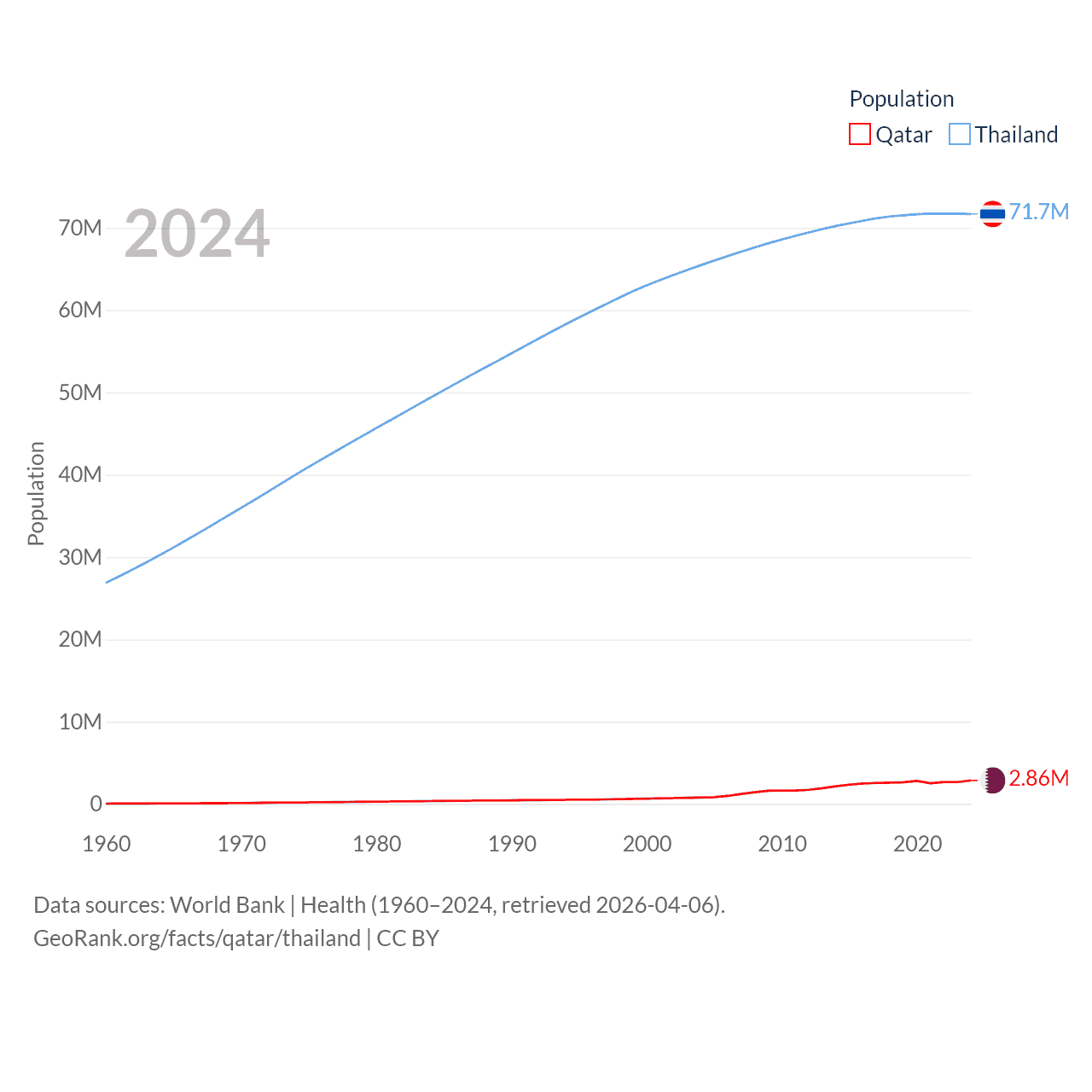 Qatar has a population of 2.86M (ranked 138/197), compared with 71.7M in Thailand (ranked 20/197). Qatar's land area is 4,436 sq mi versus 197,256 sq mi for Thailand (ranked 158th vs. 50th).