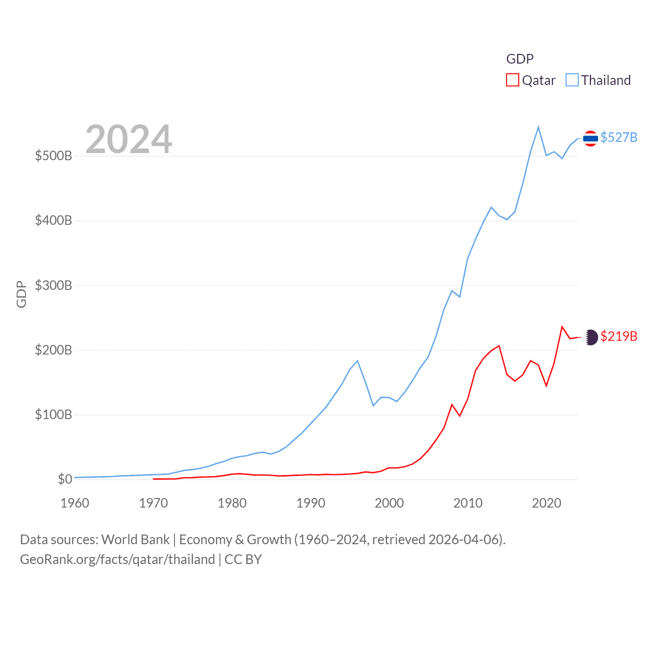 By GDP, Qatar ranks 56/197 ($219B) and Thailand ranks 31/197 ($527B). By GDP per capita, Qatar ranks 11/197 ($76,689), while Thailand ranks 100/197 ($7,347).