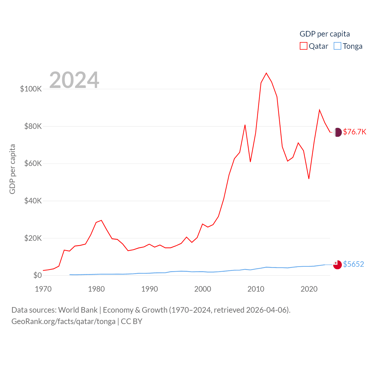 By GDP, Qatar ranks 56/197 ($219B) and Tonga ranks 191/197 ($591M). By GDP per capita, Qatar ranks 11/197 ($76,689), while Tonga ranks 115/197 ($5,652).
