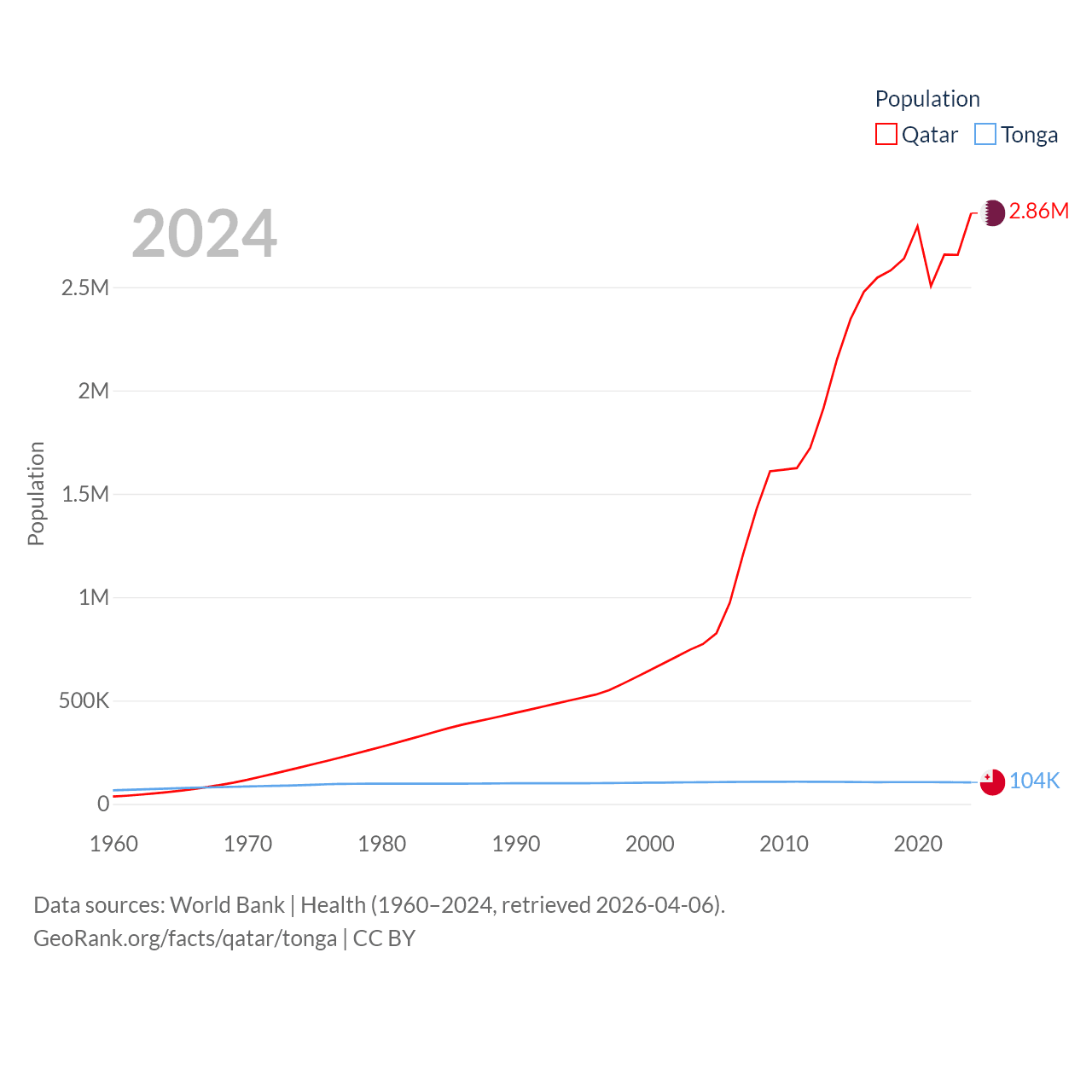 Qatar has a population of 2.86M (ranked 138/197), compared with 104K in Tonga (ranked 183/197). Qatar's land area is 4,436 sq mi versus 278 sq mi for Tonga (ranked 158th vs. 176th).