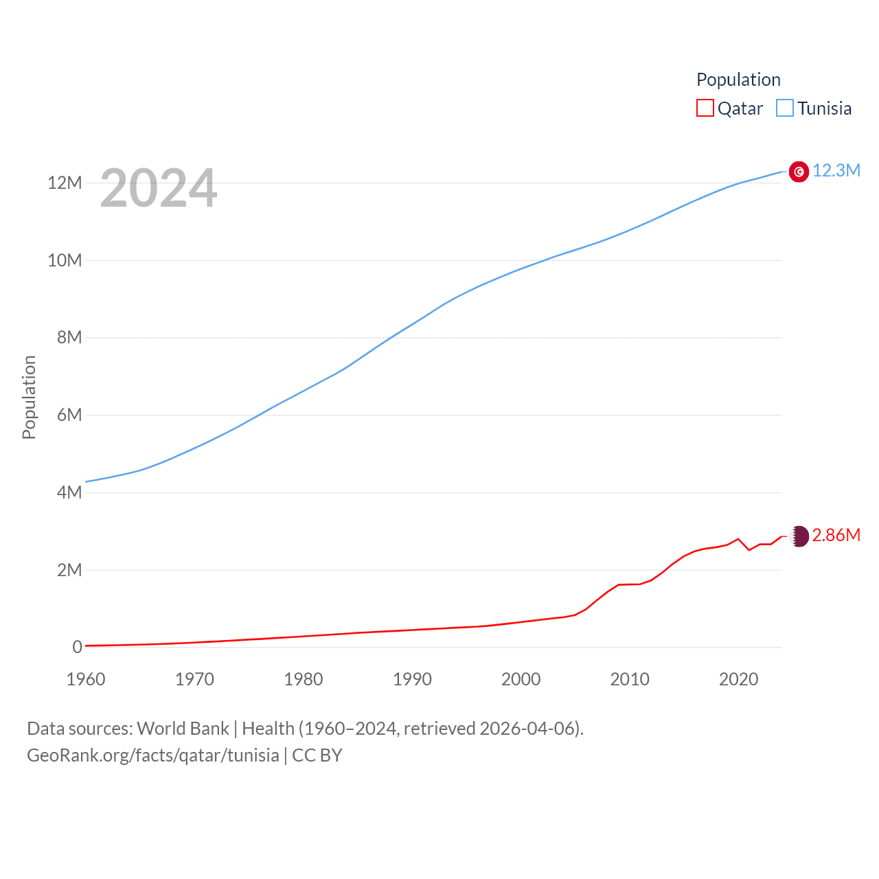 Qatar has a population of 2.86M (ranked 138/197), compared with 12.3M in Tunisia (ranked 80/197). Qatar's land area is 4,436 sq mi versus 59,985 sq mi for Tunisia (ranked 158th vs. 91st).
