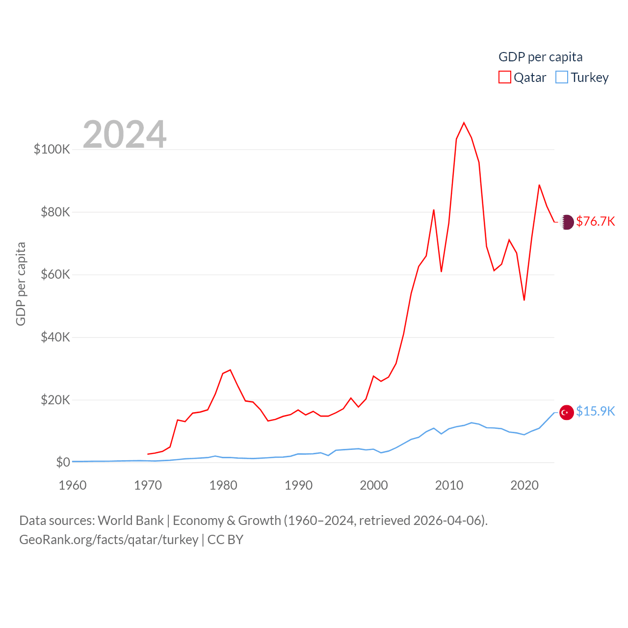 By GDP, Qatar ranks 56/197 ($219B) and Turkey ranks 17/197 ($1.36T). By GDP per capita, Qatar ranks 11/197 ($76,689), while Turkey ranks 66/197 ($15,893).
