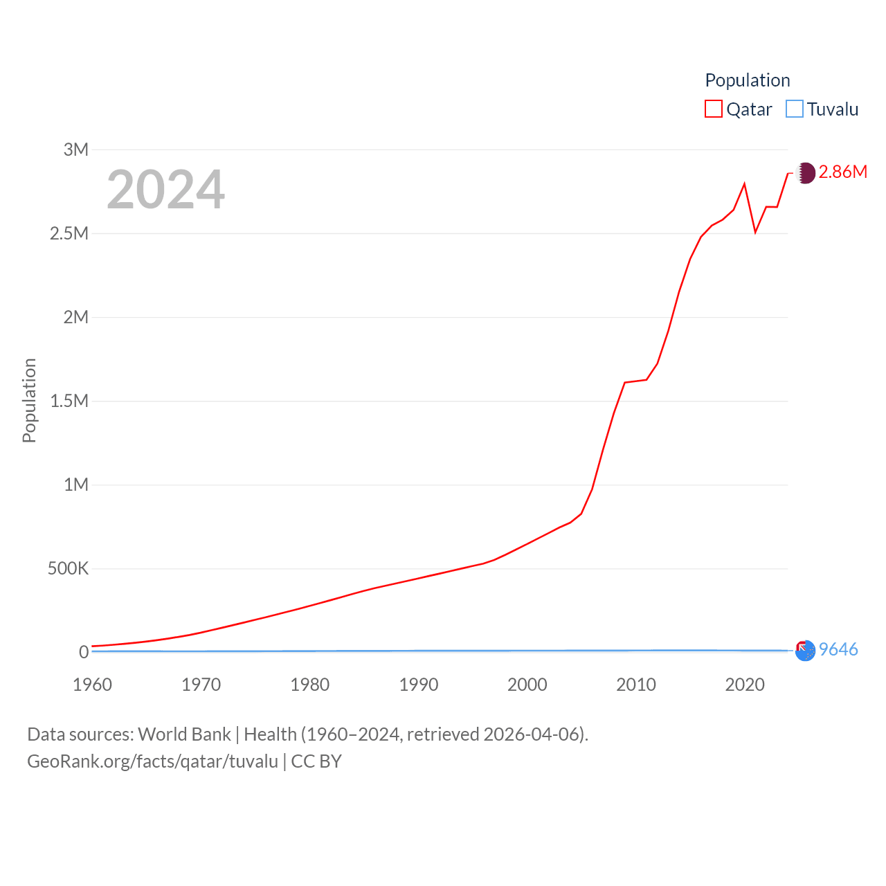 Qatar has a population of 2.86M (ranked 138/197), compared with 9.65K in Tuvalu (ranked 196/197). Qatar's land area is 4,436 sq mi versus 11.6 sq mi for Tuvalu (ranked 158th vs. 194th).