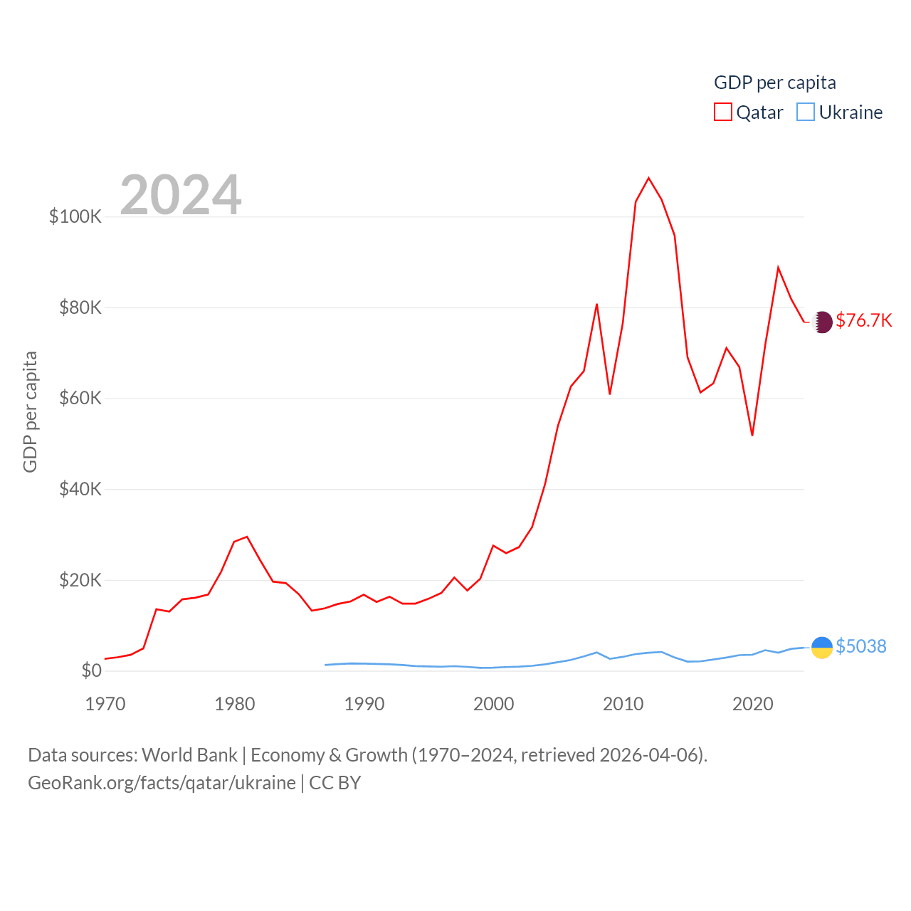 By GDP, Qatar ranks 56/197 ($219B) and Ukraine ranks 57/197 ($191B). By GDP per capita, Qatar ranks 11/197 ($76,689), while Ukraine ranks 120/197 ($5,038).