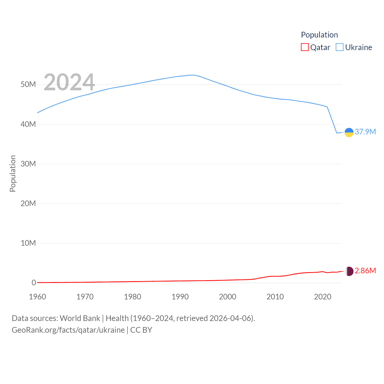 Qatar has a population of 2.86M (ranked 138/197), compared with 37.9M in Ukraine (ranked 41/197). Qatar's land area is 4,436 sq mi versus 223,708 sq mi for Ukraine (ranked 158th vs. 46th).