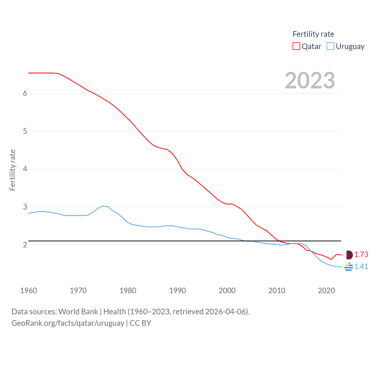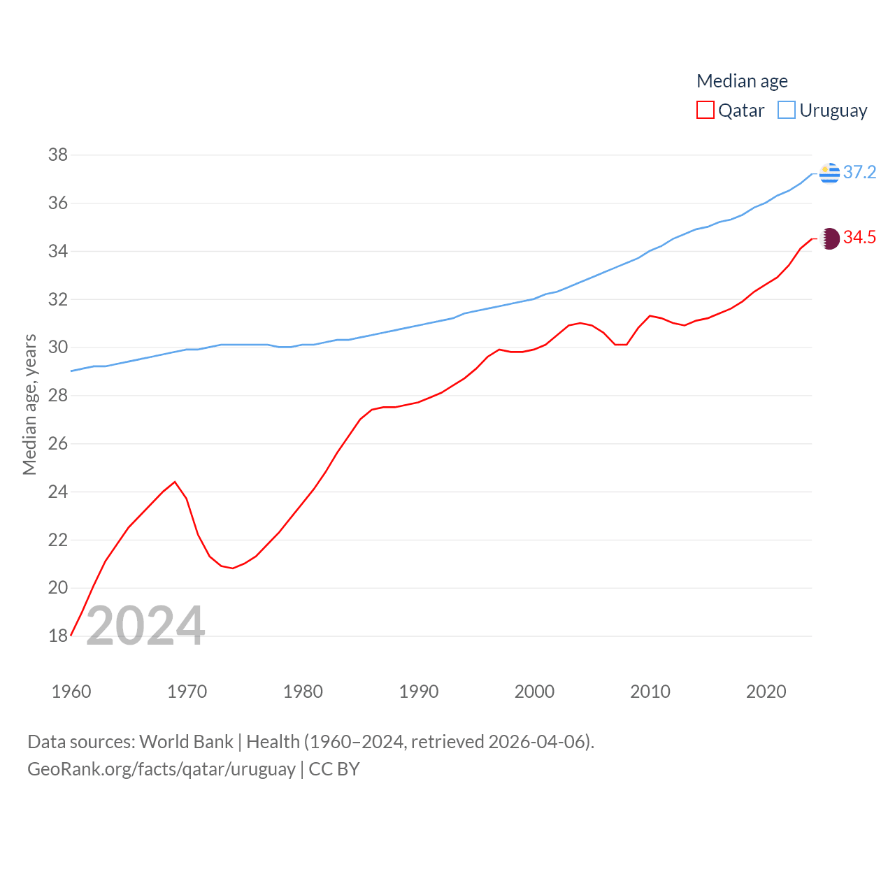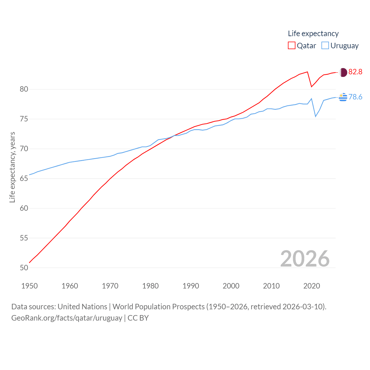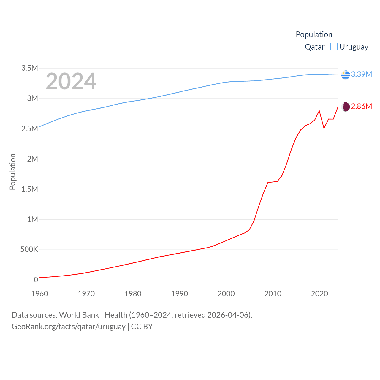 Qatar has a population of 2.86M (ranked 138/197), compared with 3.39M in Uruguay (ranked 133/197). Qatar's land area is 4,436 sq mi versus 67,576 sq mi for Uruguay (ranked 158th vs. 89th).