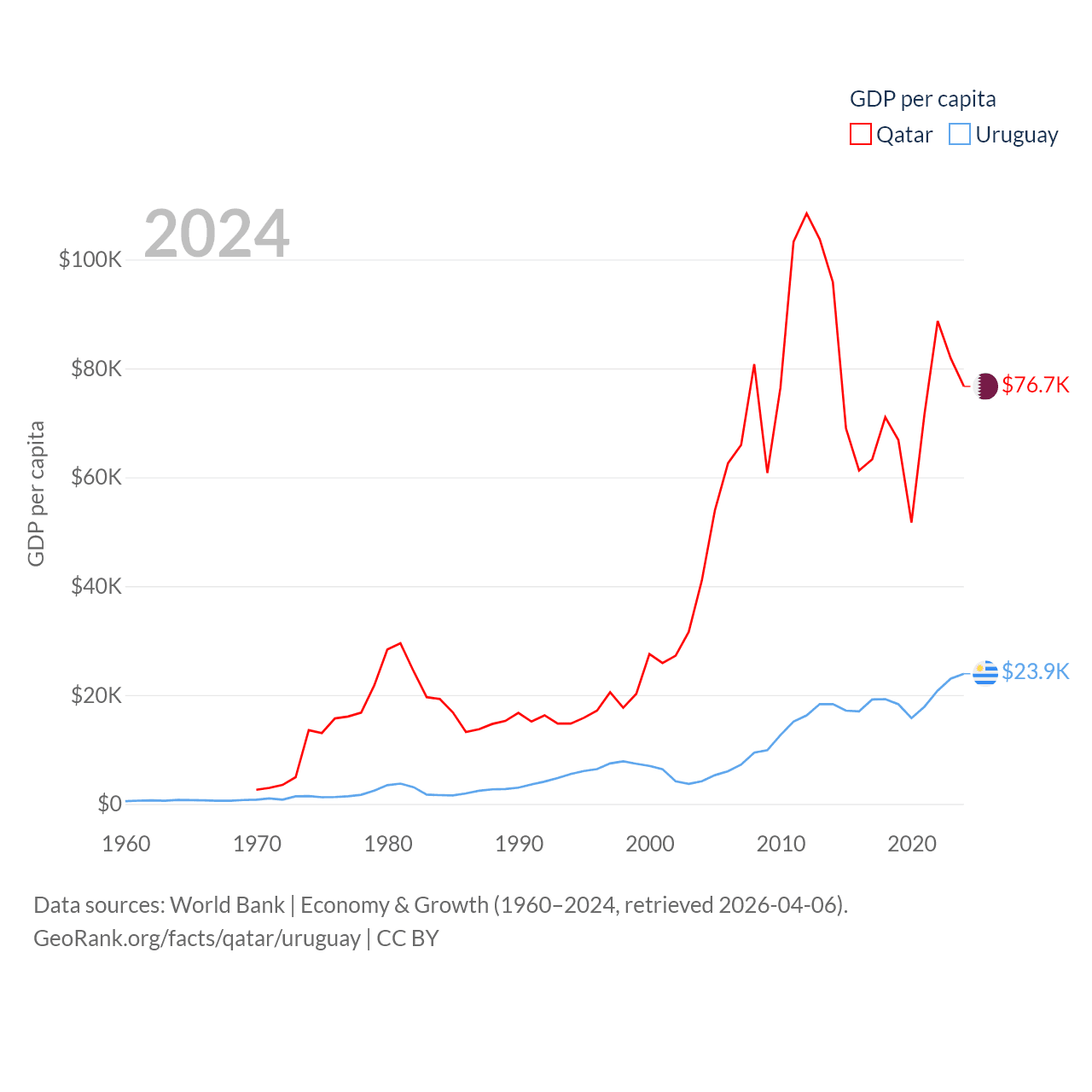 By GDP, Qatar ranks 56/197 ($219B) and Uruguay ranks 81/197 ($81B). By GDP per capita, Qatar ranks 11/197 ($76,689), while Uruguay ranks 52/197 ($23,907).