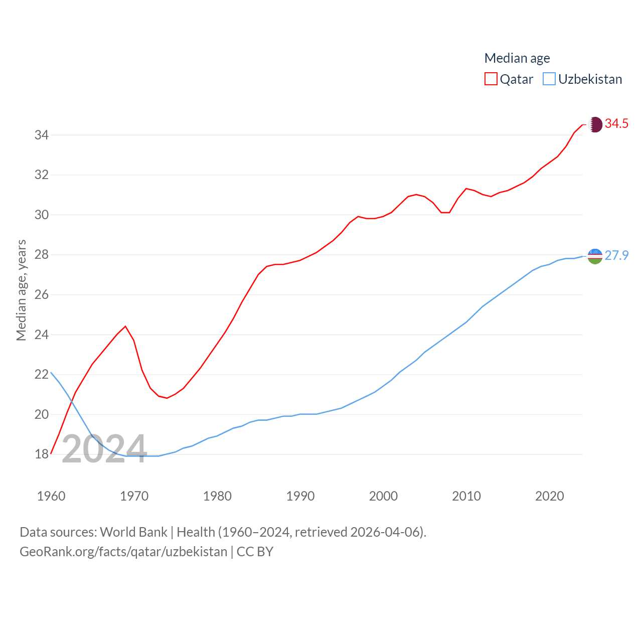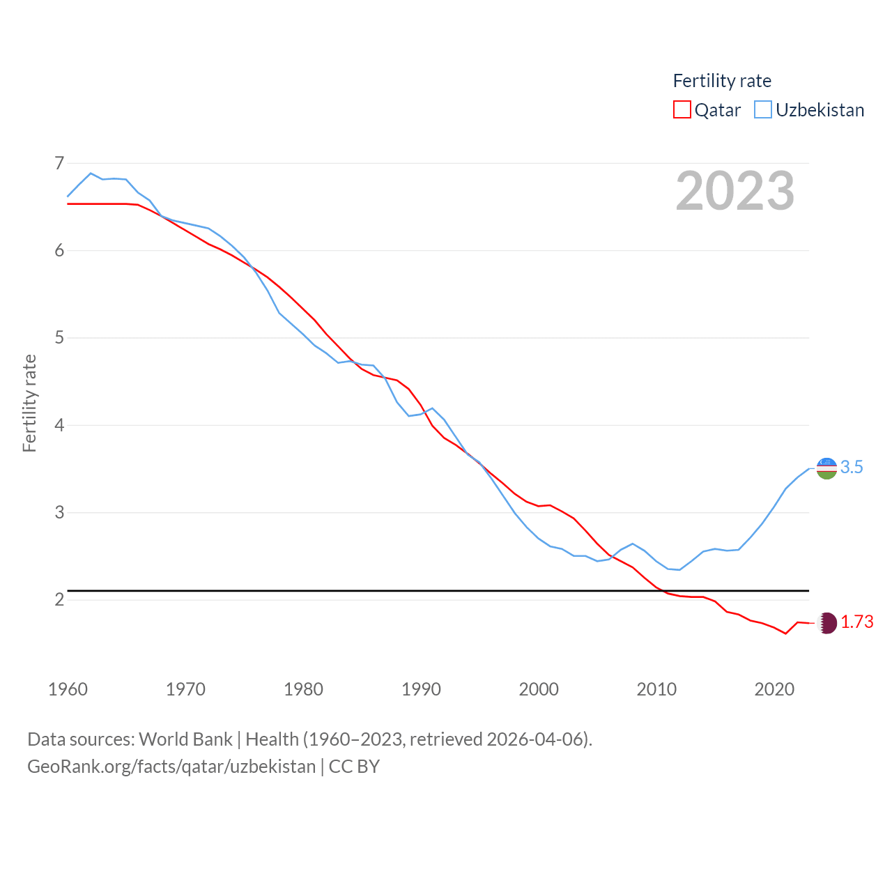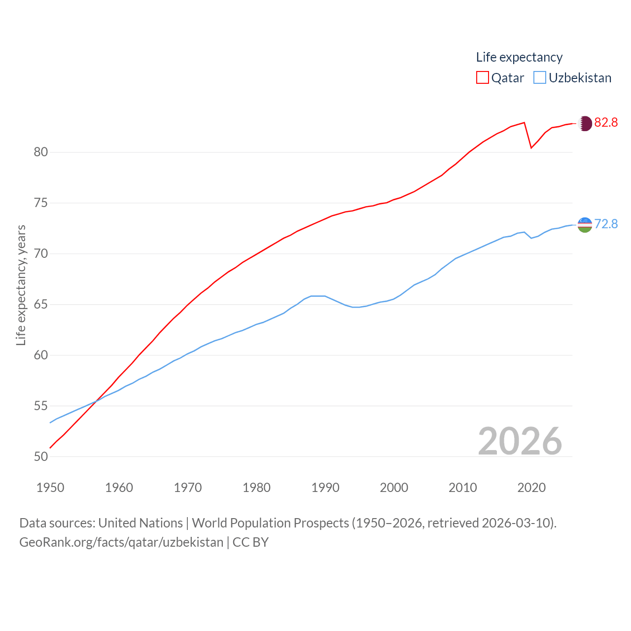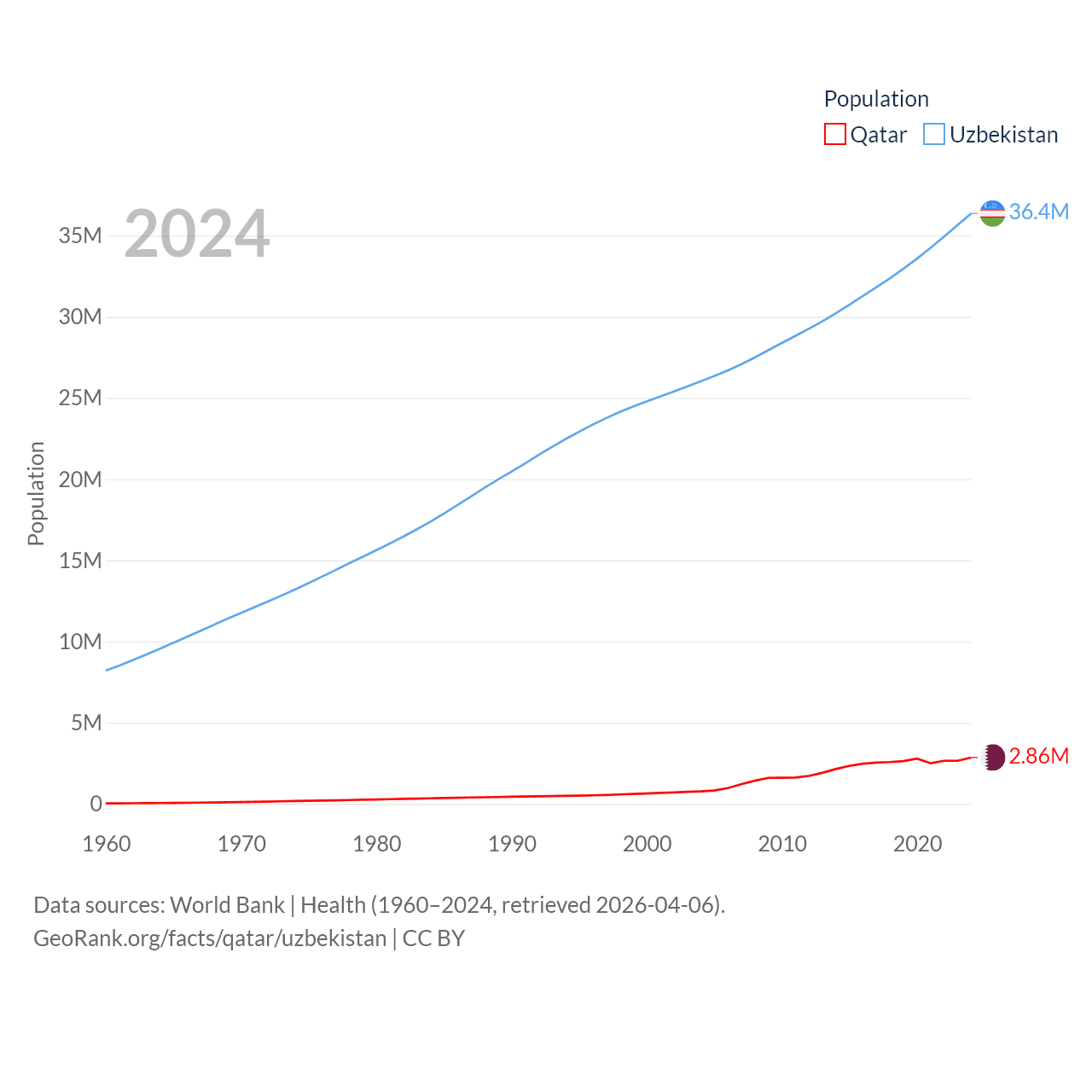 Qatar has a population of 2.86M (ranked 138/197), compared with 36.4M in Uzbekistan (ranked 43/197). Qatar's land area is 4,436 sq mi versus 170,136 sq mi for Uzbekistan (ranked 158th vs. 56th).