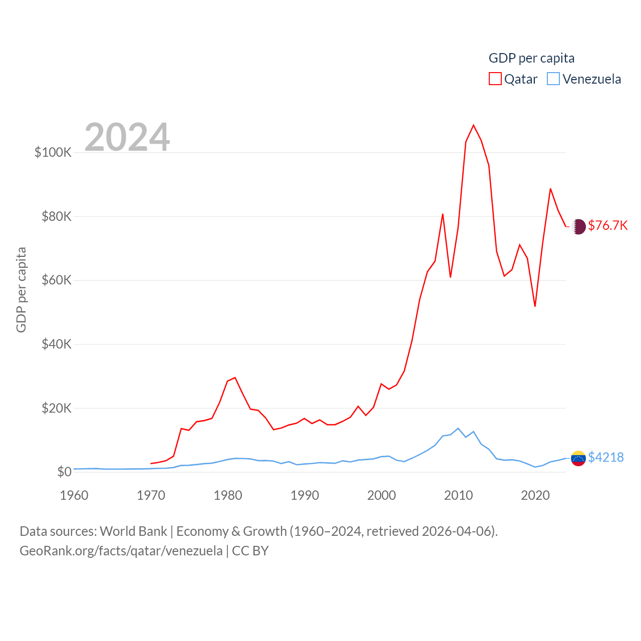 By GDP, Qatar ranks 56/197 ($219B) and Venezuela ranks 65/197 ($120B). By GDP per capita, Qatar ranks 11/197 ($76,689), while Venezuela ranks 128/197 ($4,218).