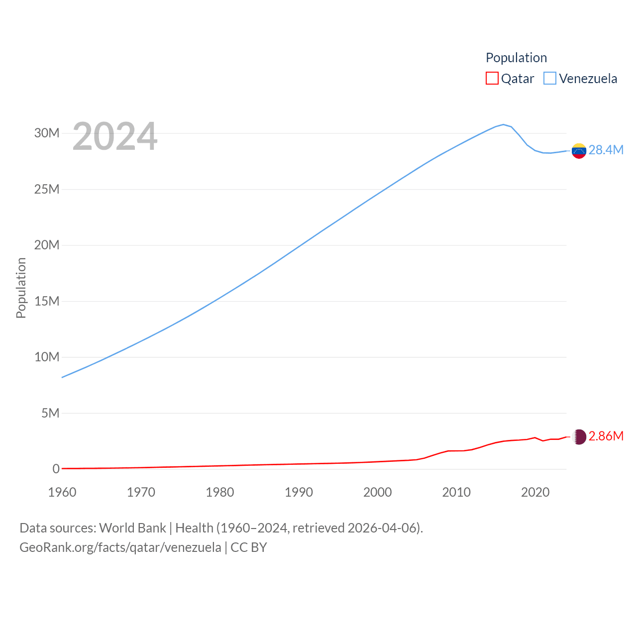 Qatar has a population of 2.86M (ranked 138/197), compared with 28.4M in Venezuela (ranked 53/197). Qatar's land area is 4,436 sq mi versus 340,561 sq mi for Venezuela (ranked 158th vs. 32nd).