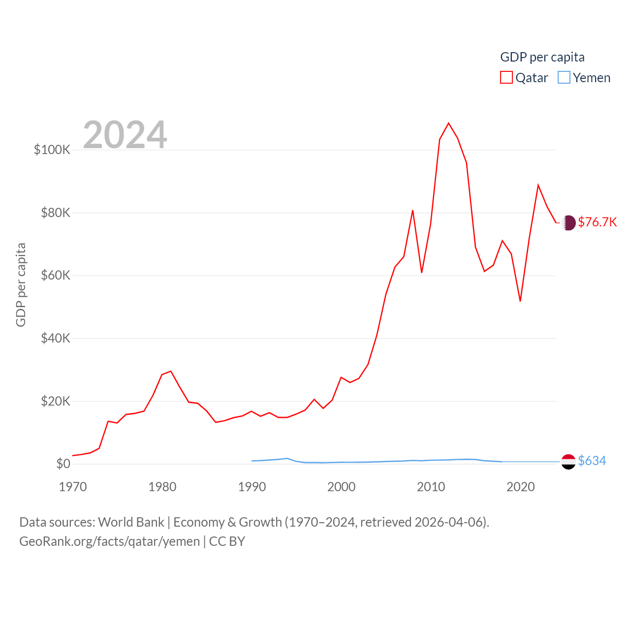 By GDP, Qatar ranks 56/197 ($219B) and Yemen ranks 125/197 ($21.6B). By GDP per capita, Qatar ranks 11/197 ($76,689), while Yemen ranks 191/197 ($634).