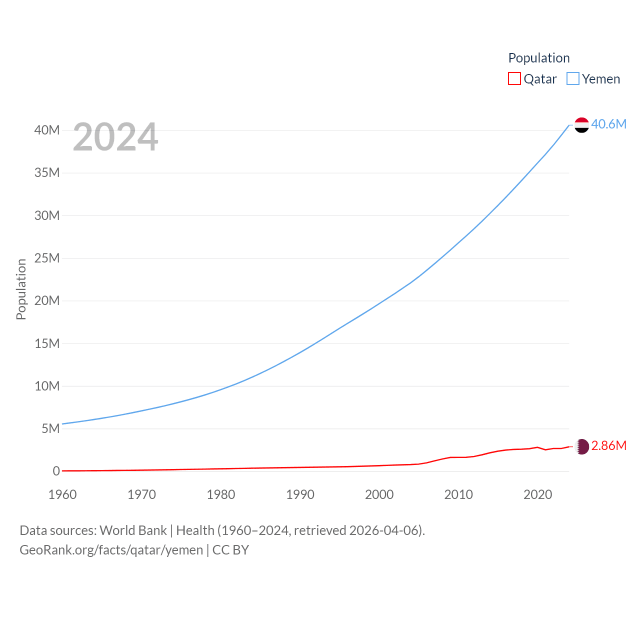 Qatar has a population of 2.86M (ranked 138/197), compared with 40.6M in Yemen (ranked 38/197). Qatar's land area is 4,436 sq mi versus 203,850 sq mi for Yemen (ranked 158th vs. 49th).