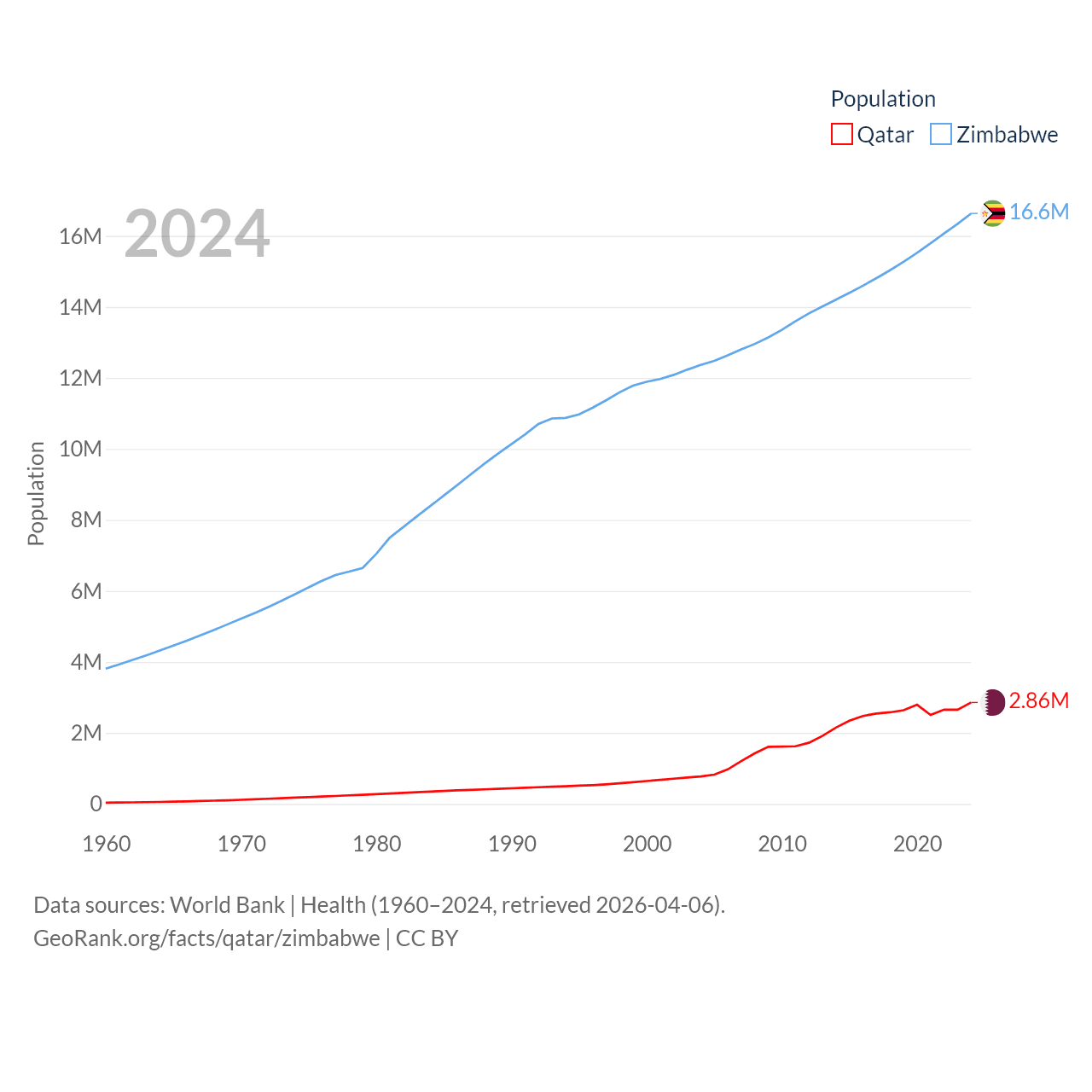 Qatar has a population of 2.86M (ranked 138/197), compared with 16.6M in Zimbabwe (ranked 74/197). Qatar's land area is 4,436 sq mi versus 149,364 sq mi for Zimbabwe (ranked 158th vs. 60th).