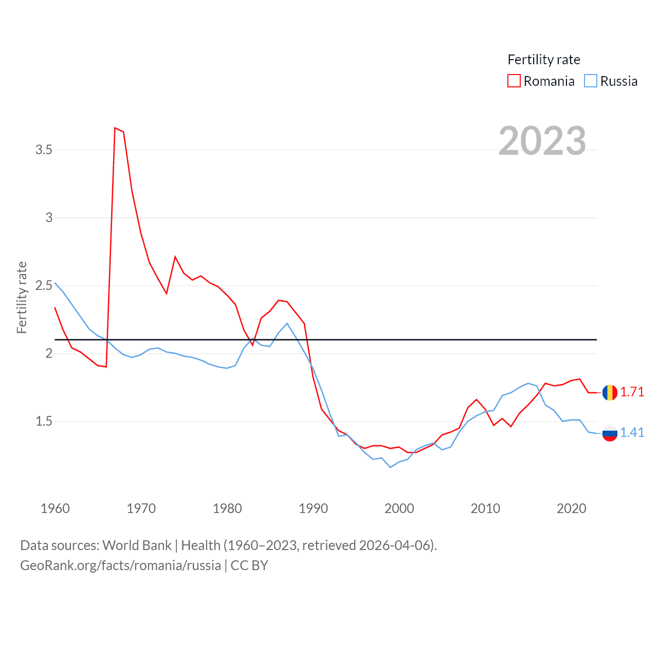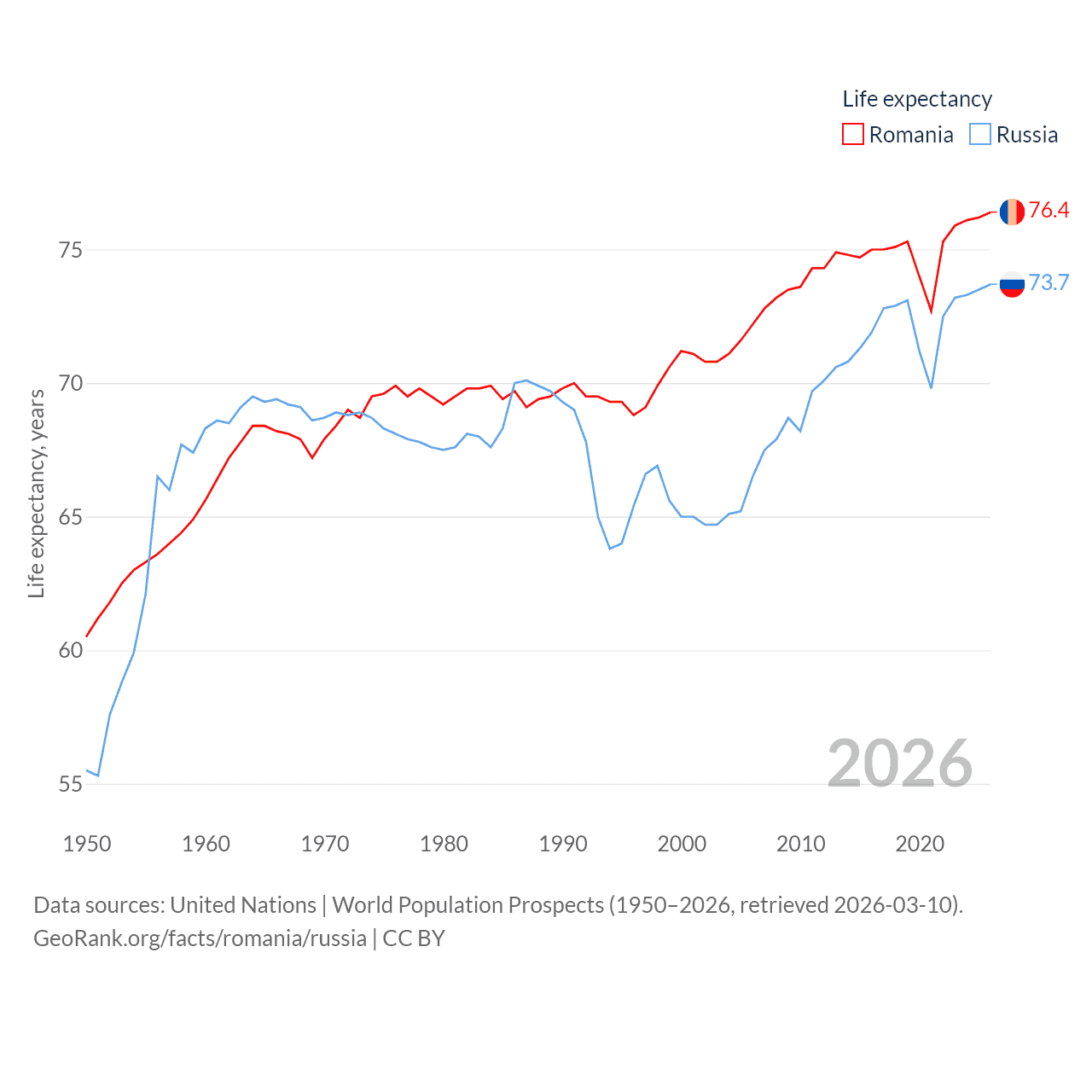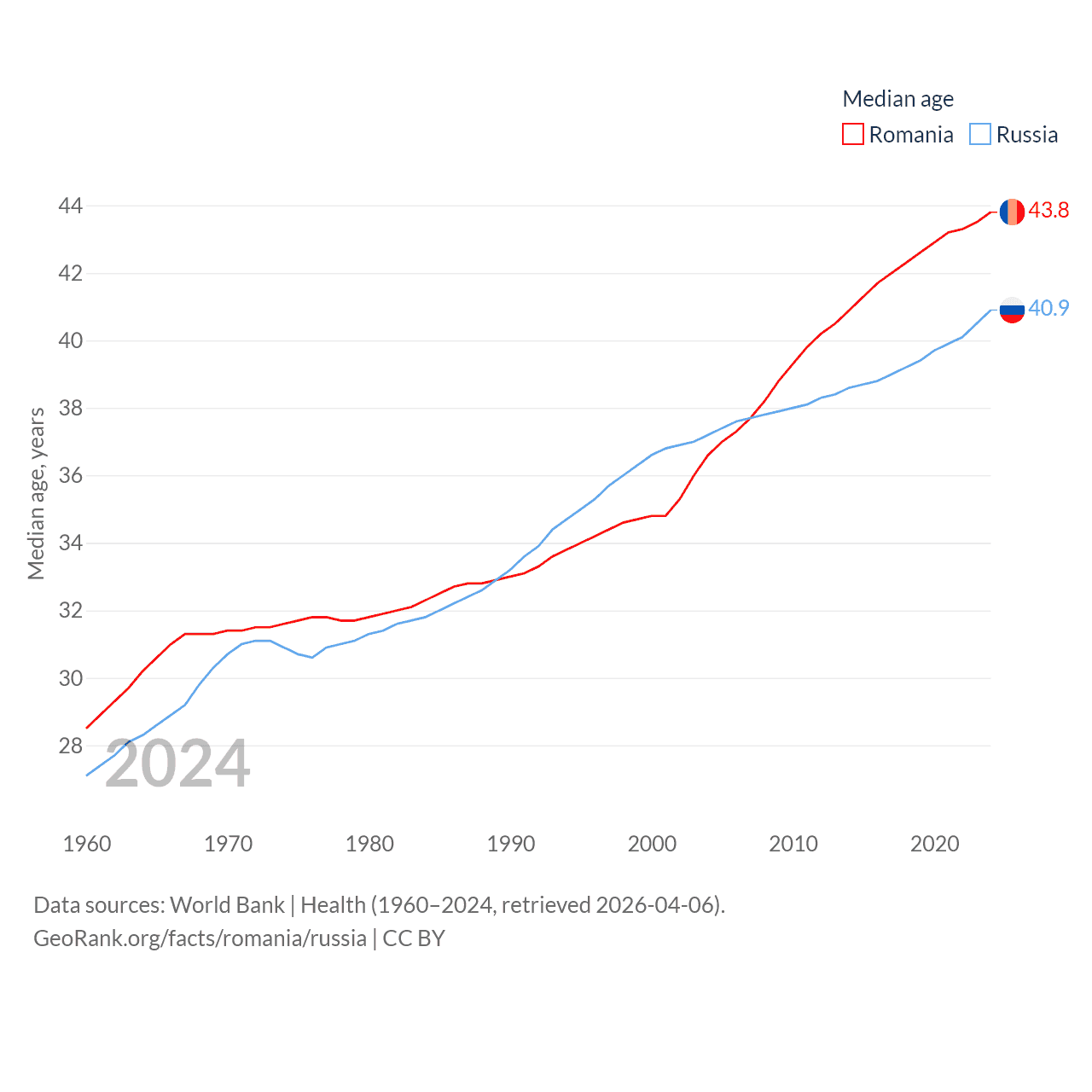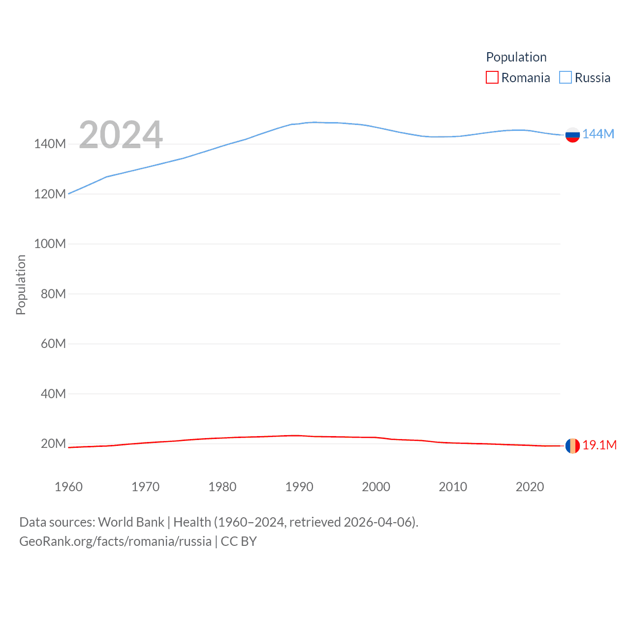 Romania has a population of 19.1M (ranked 67/197), compared with 144M in Russia (ranked 9/197). Romania's land area is 88,834 sq mi versus 6,323,145 sq mi for Russia (ranked 80th vs. 1st).