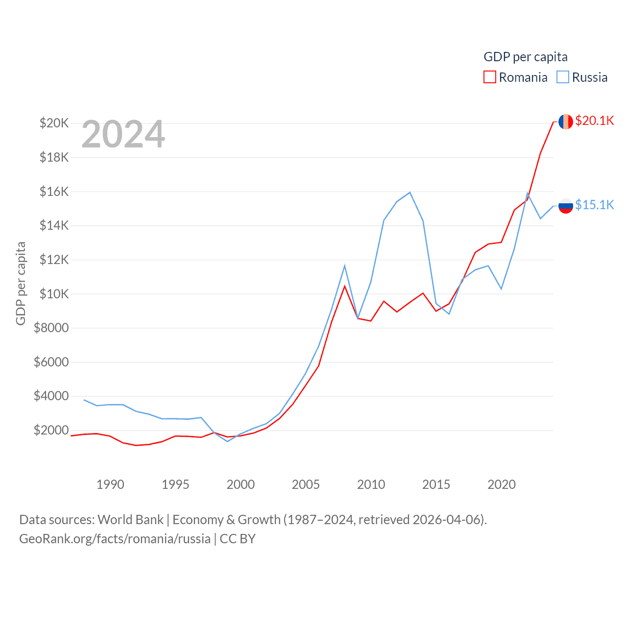 By GDP, Romania ranks 42/197 ($383B) and Russia ranks 11/197 ($2.17T). By GDP per capita, Romania ranks 58/197 ($20,080), while Russia ranks 68/197 ($15,145).
