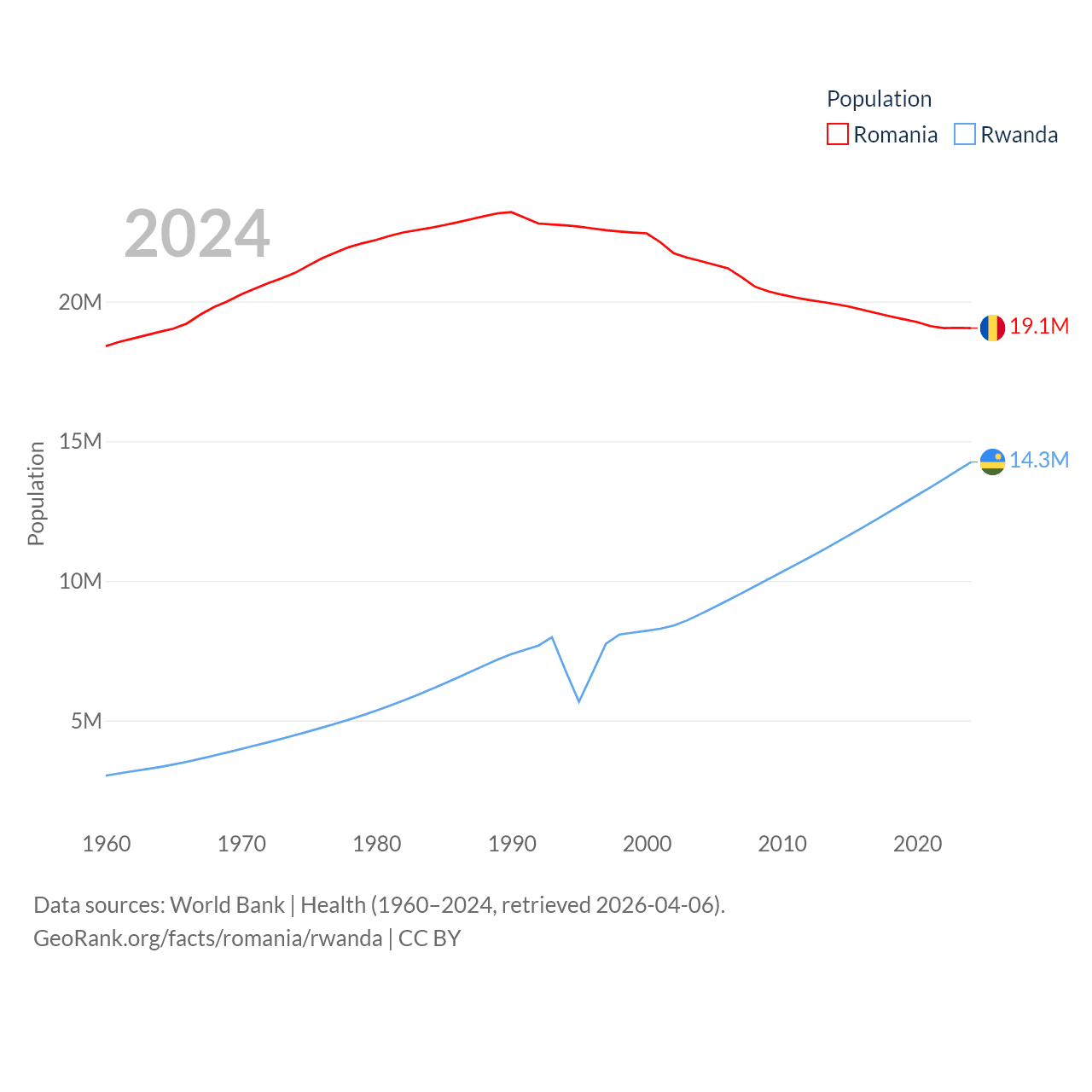 Romania has a population of 19.1M (ranked 67/197), compared with 14.3M in Rwanda (ranked 77/197). Romania's land area is 88,834 sq mi versus 9,525 sq mi for Rwanda (ranked 80th vs. 146th).