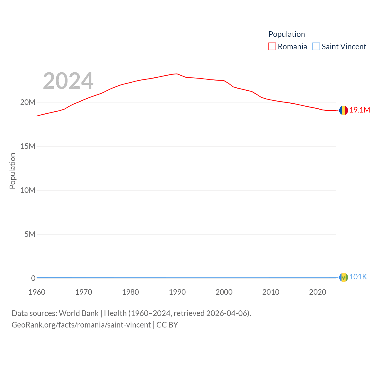 Romania has a population of 19.1M (ranked 67/197), compared with 101K in Saint Vincent (ranked 184/197). Romania's land area is 88,834 sq mi versus 150.6 sq mi for Saint Vincent (ranked 80th vs. 185th).