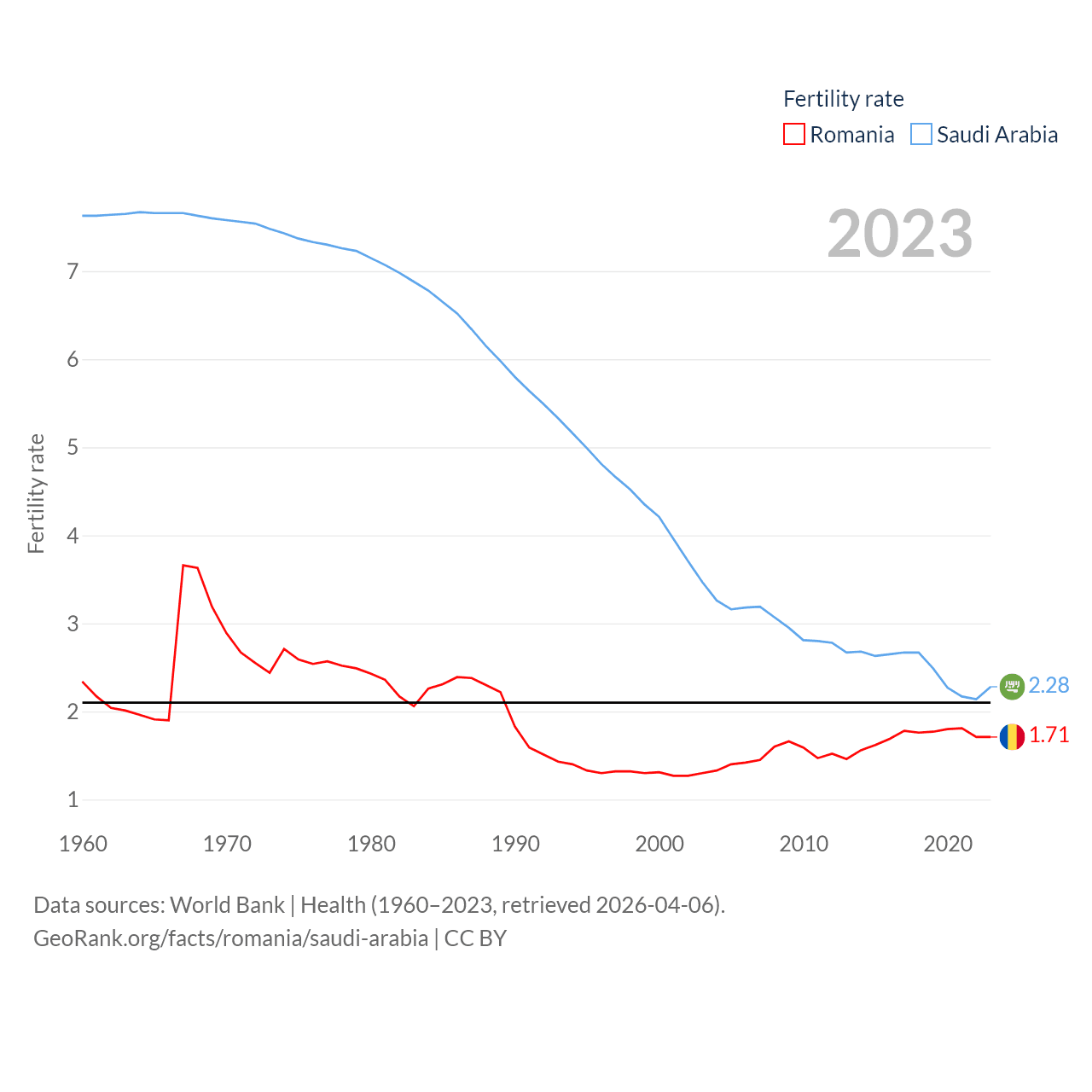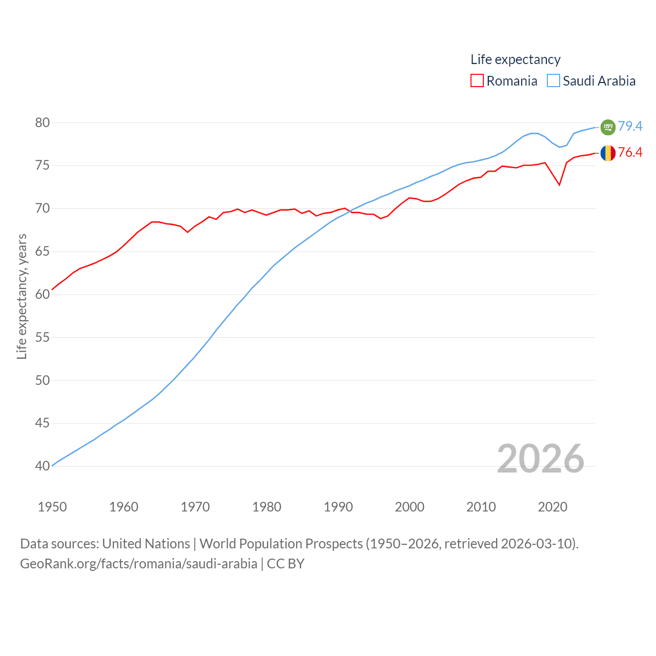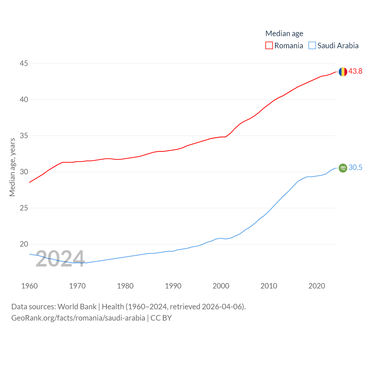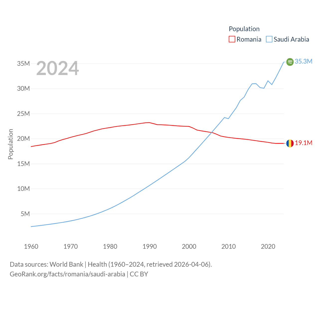 Romania has a population of 19.1M (ranked 67/197), compared with 35.3M in Saudi Arabia (ranked 45/197). Romania's land area is 88,834 sq mi versus 830,000 sq mi for Saudi Arabia (ranked 80th vs. 12th).