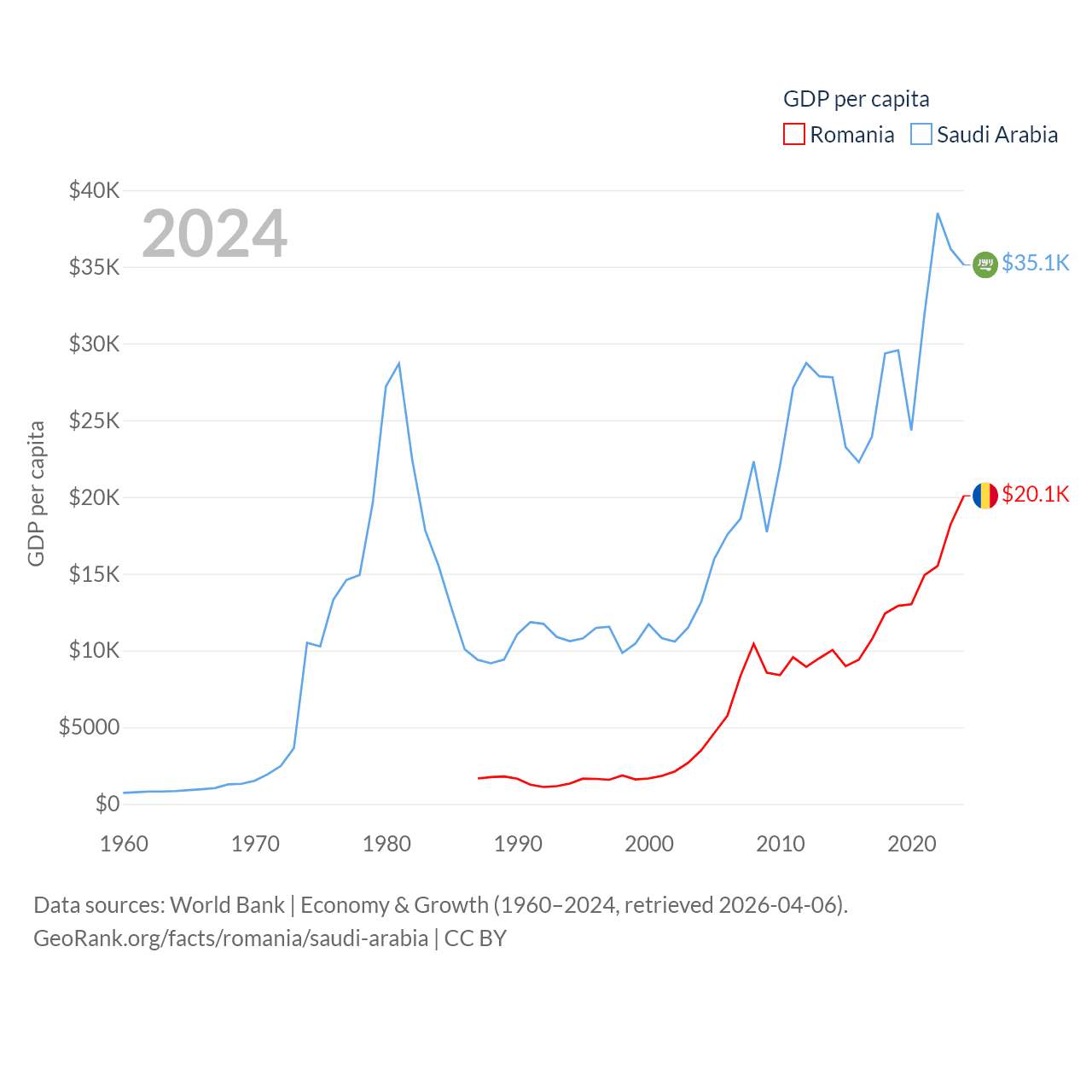 By GDP, Romania ranks 42/197 ($383B) and Saudi Arabia ranks 18/197 ($1.24T). By GDP per capita, Romania ranks 58/197 ($20,080), while Saudi Arabia ranks 33/197 ($35,122).