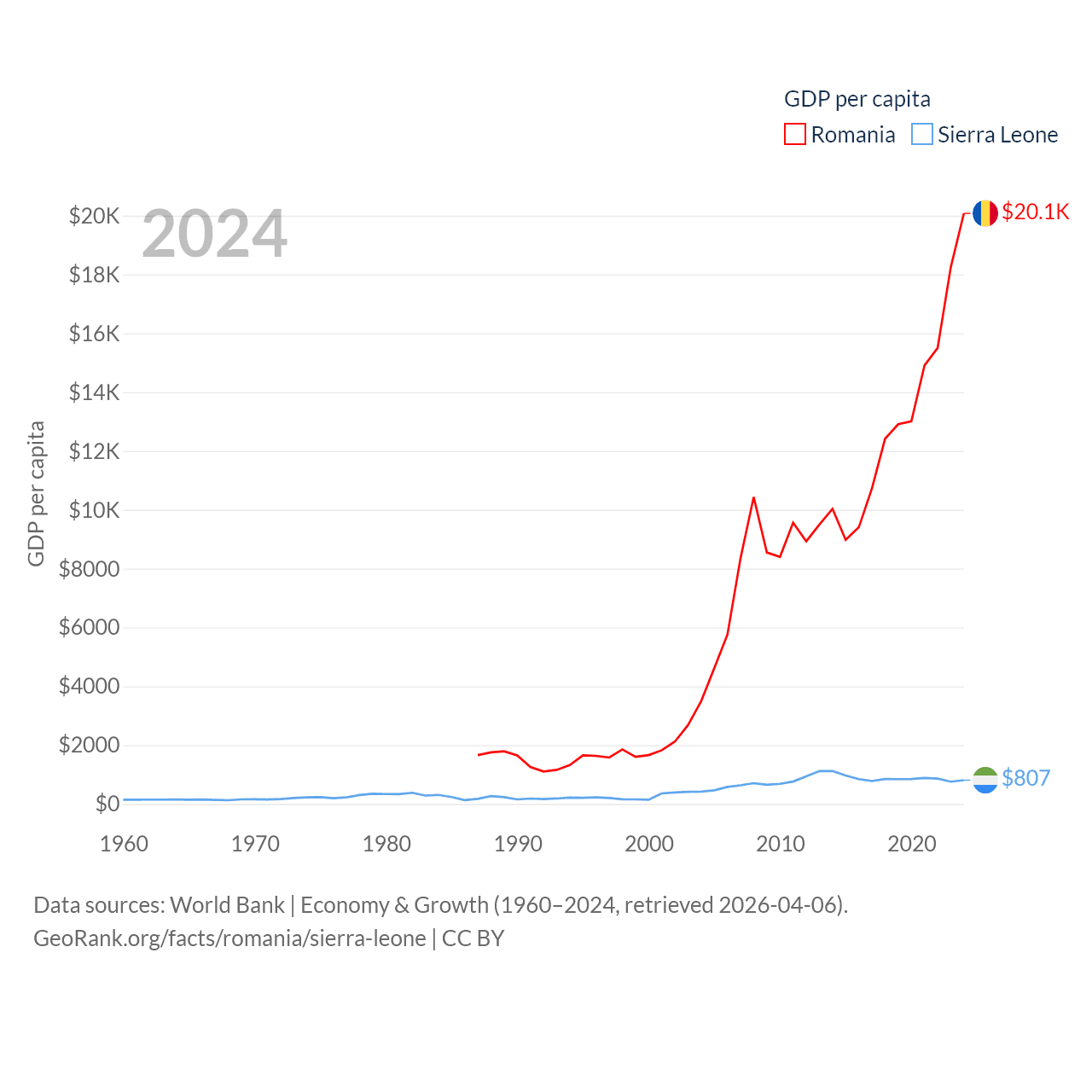 By GDP, Romania ranks 42/197 ($383B) and Sierra Leone ranks 160/197 ($6.97B). By GDP per capita, Romania ranks 58/197 ($20,080), while Sierra Leone ranks 186/197 ($807).