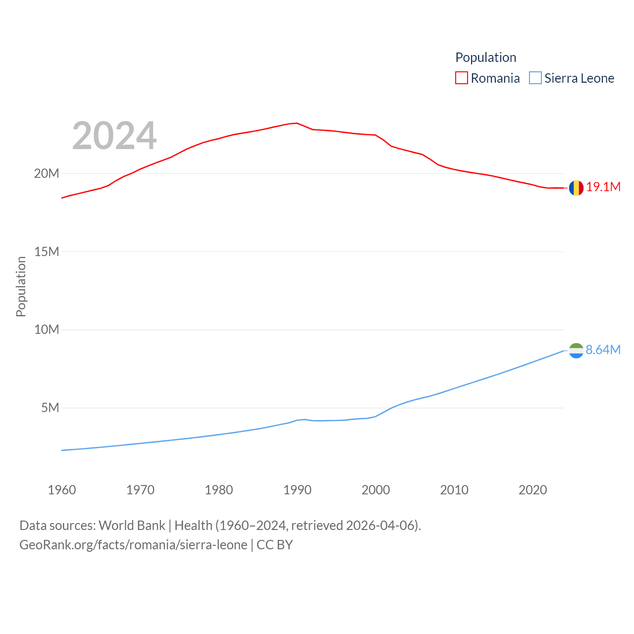 Romania has a population of 19.1M (ranked 67/197), compared with 8.64M in Sierra Leone (ranked 102/197). Romania's land area is 88,834 sq mi versus 27,869 sq mi for Sierra Leone (ranked 80th vs. 116th).
