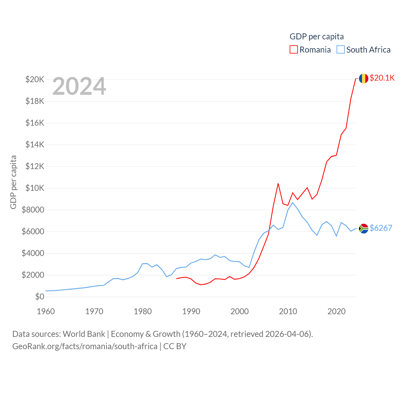 By GDP, Romania ranks 42/197 ($383B) and South Africa ranks 40/197 ($401B). By GDP per capita, Romania ranks 58/197 ($20,080), while South Africa ranks 111/197 ($6,267).