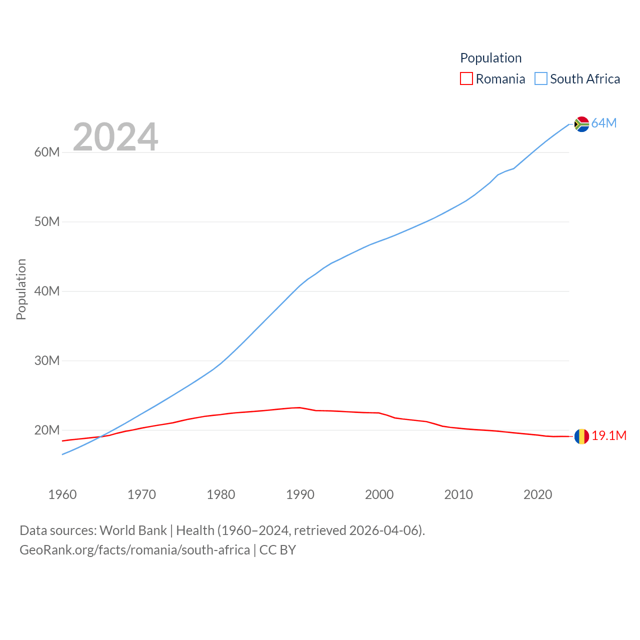 Romania has a population of 19.1M (ranked 67/197), compared with 64M in South Africa (ranked 24/197). Romania's land area is 88,834 sq mi versus 468,377 sq mi for South Africa (ranked 80th vs. 24th).