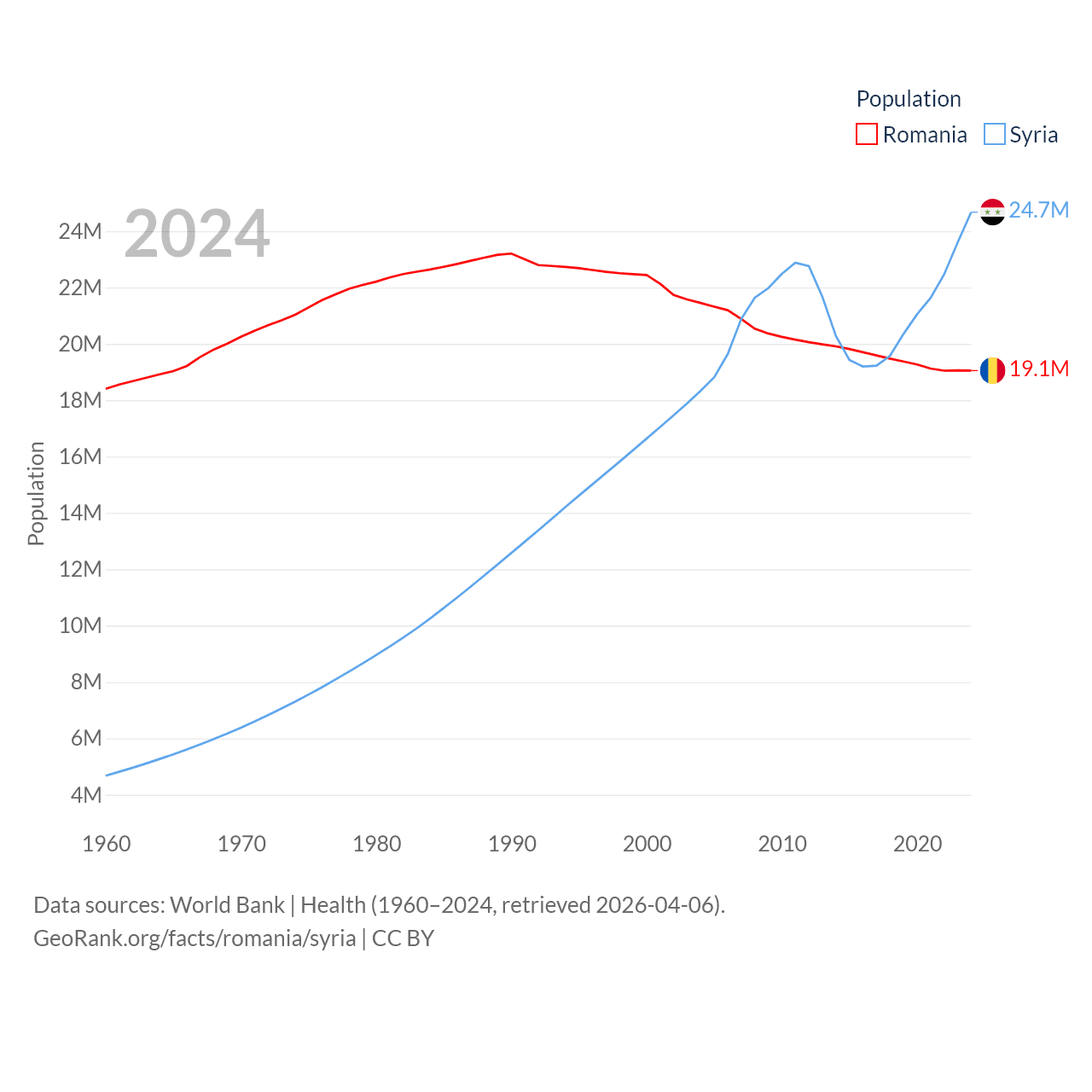 Romania has a population of 19.1M (ranked 67/197), compared with 24.7M in Syria (ranked 57/197). Romania's land area is 88,834 sq mi versus 70,900 sq mi for Syria (ranked 80th vs. 87th).