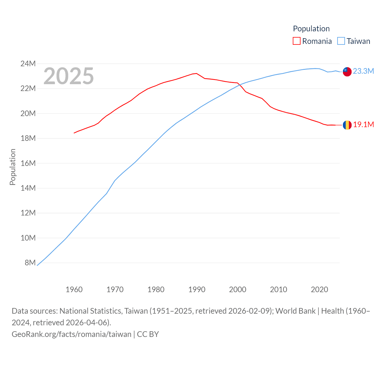 Romania has a population of 19.1M (ranked 67/197), compared with 23.3M in Taiwan (ranked 60/197). Romania's land area is 88,834 sq mi versus 13,976 sq mi for Taiwan (ranked 80th vs. 133rd).