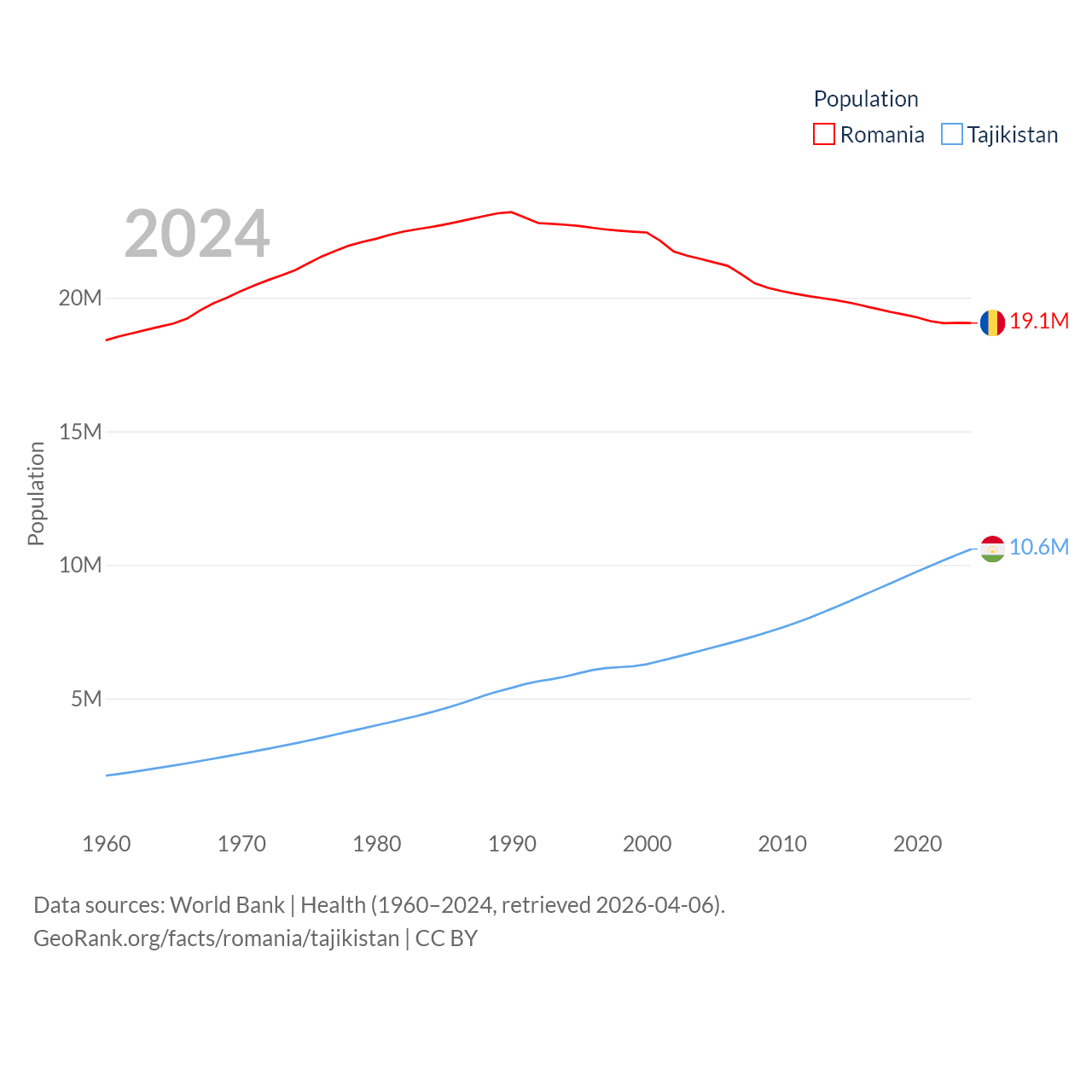 Romania has a population of 19.1M (ranked 67/197), compared with 10.6M in Tajikistan (ranked 91/197). Romania's land area is 88,834 sq mi versus 53,587 sq mi for Tajikistan (ranked 80th vs. 93rd).