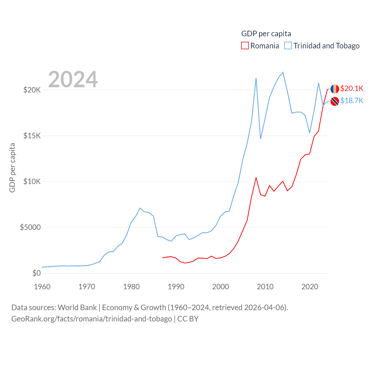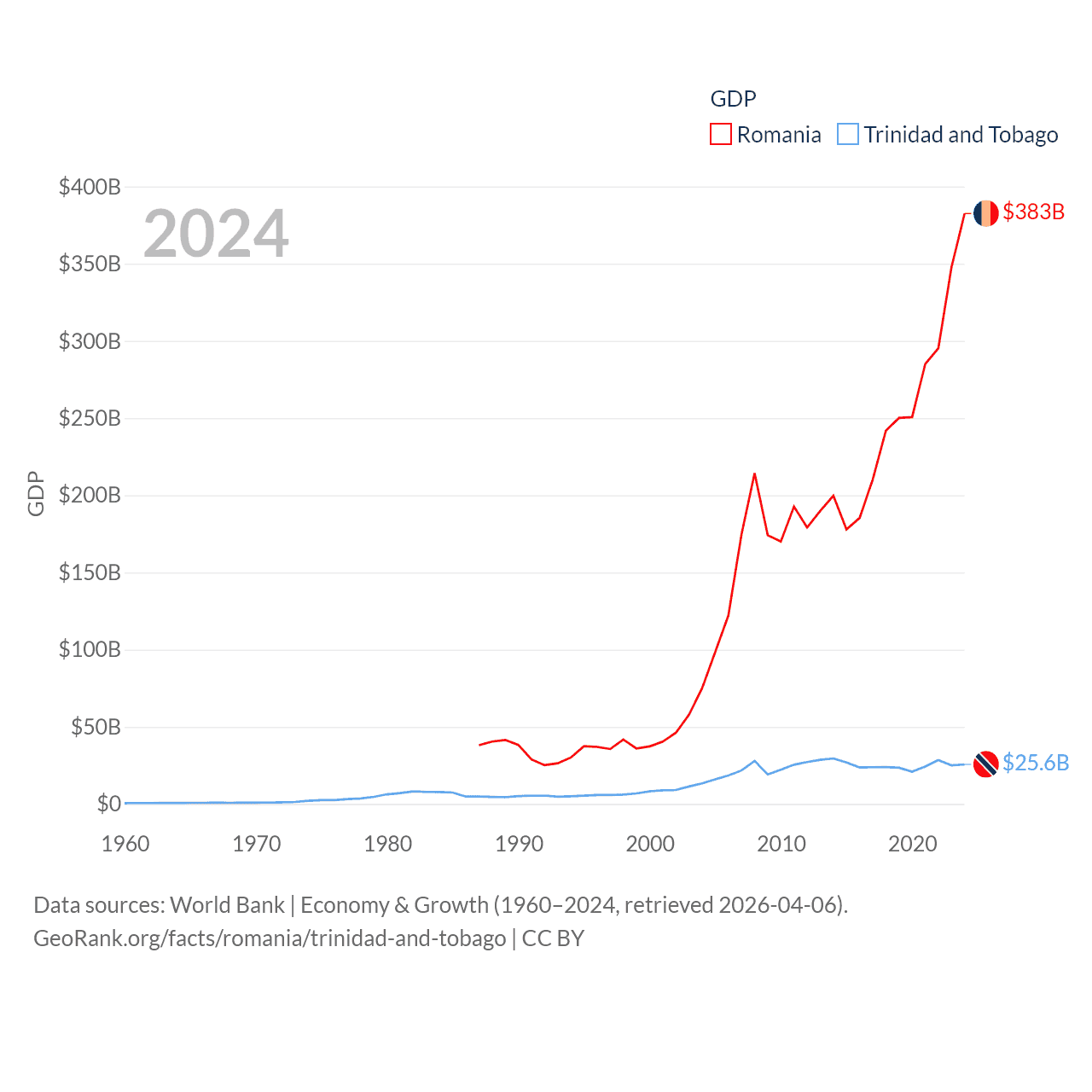 By GDP, Romania ranks 42/197 ($383B) and Trinidad and Tobago ranks 115/197 ($25.6B). By GDP per capita, Romania ranks 58/197 ($20,080), while Trinidad and Tobago ranks 61/197 ($18,733).