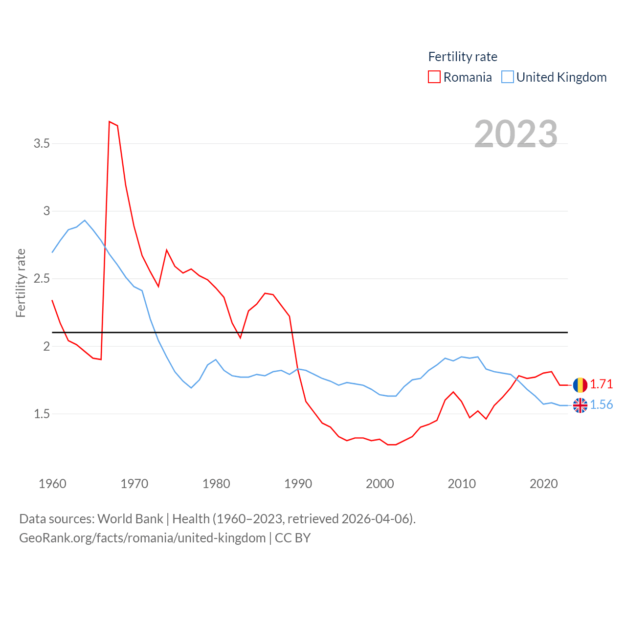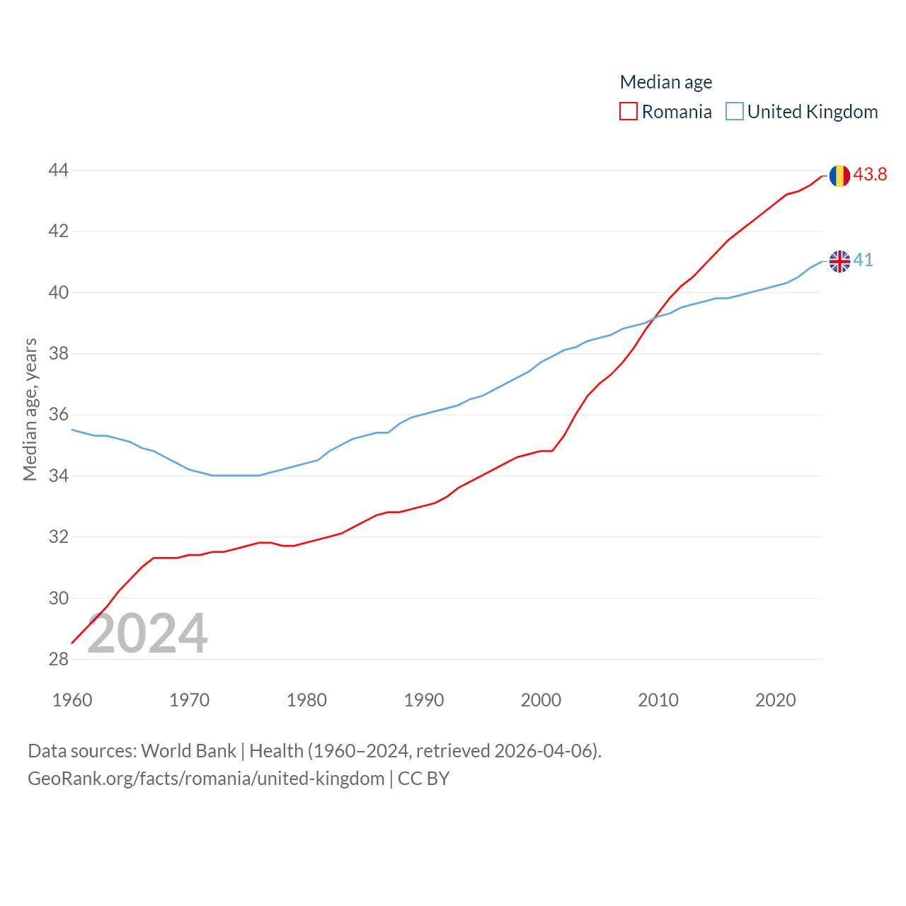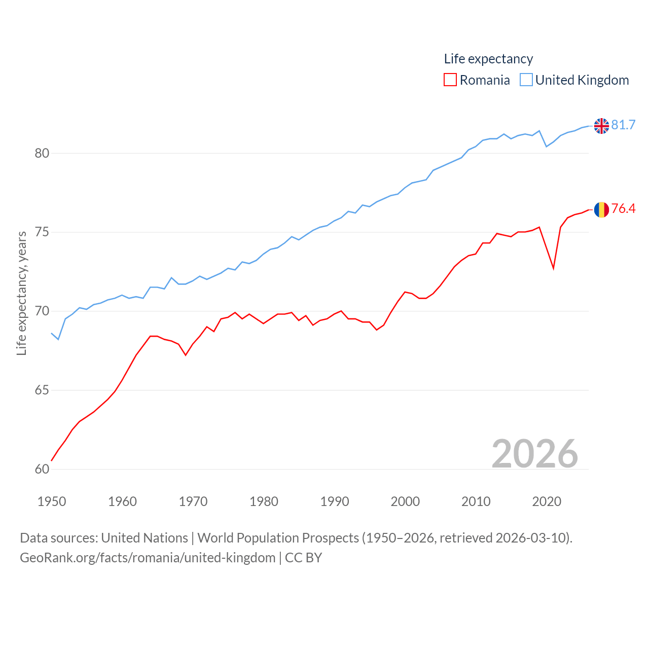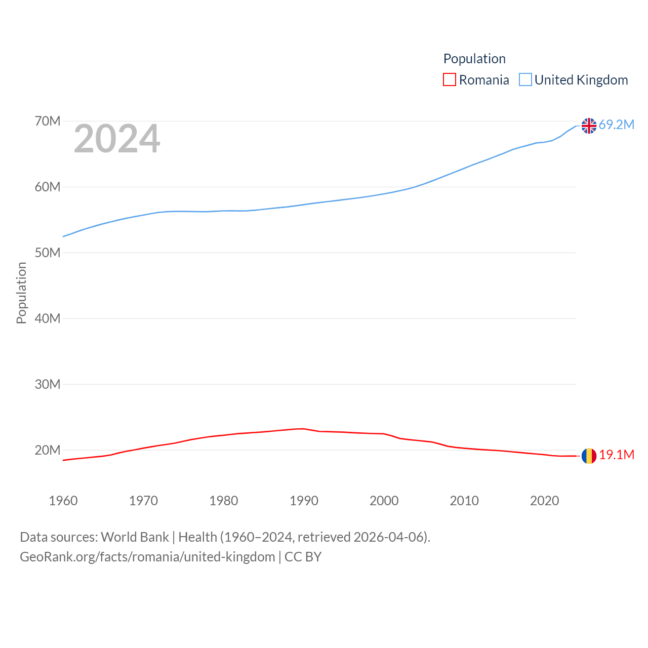 Romania has a population of 19.1M (ranked 67/197), compared with 69.2M in The United Kingdom (ranked 21/197). Romania's land area is 88,834 sq mi versus 93,410 sq mi for The United Kingdom (ranked 80th vs. 78th).