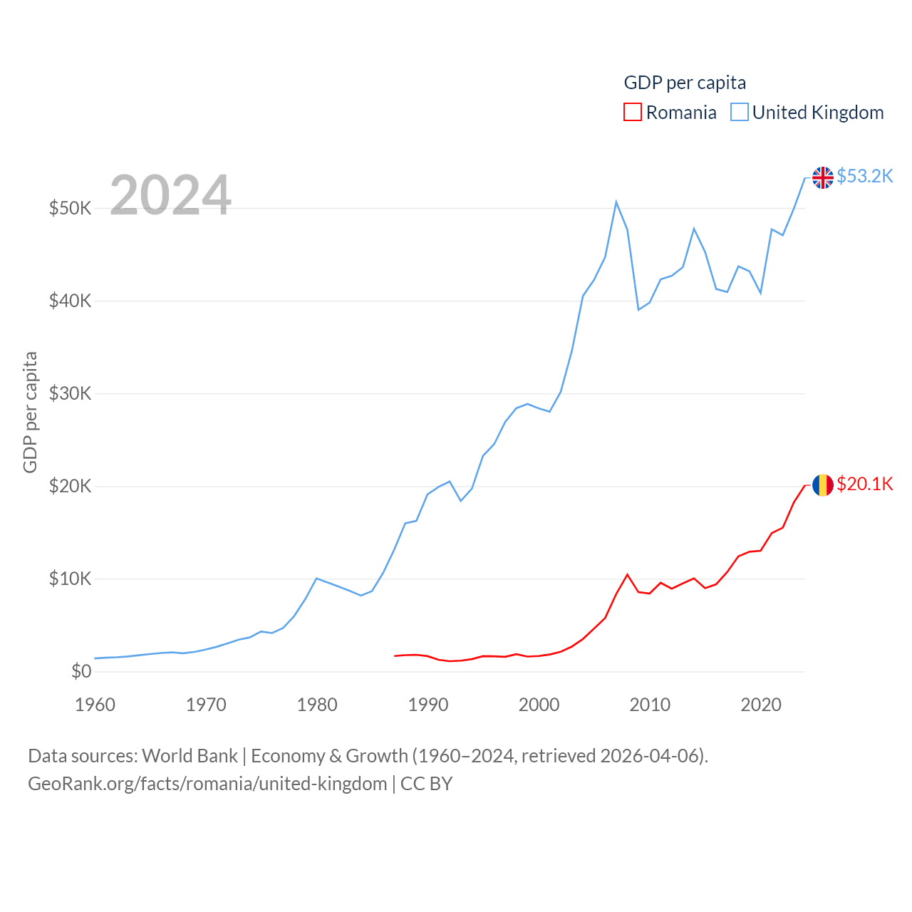 By GDP, Romania ranks 42/197 ($383B) and The United Kingdom ranks 6/197 ($3.69T). By GDP per capita, Romania ranks 58/197 ($20,080), while The United Kingdom ranks 22/197 ($53,246).