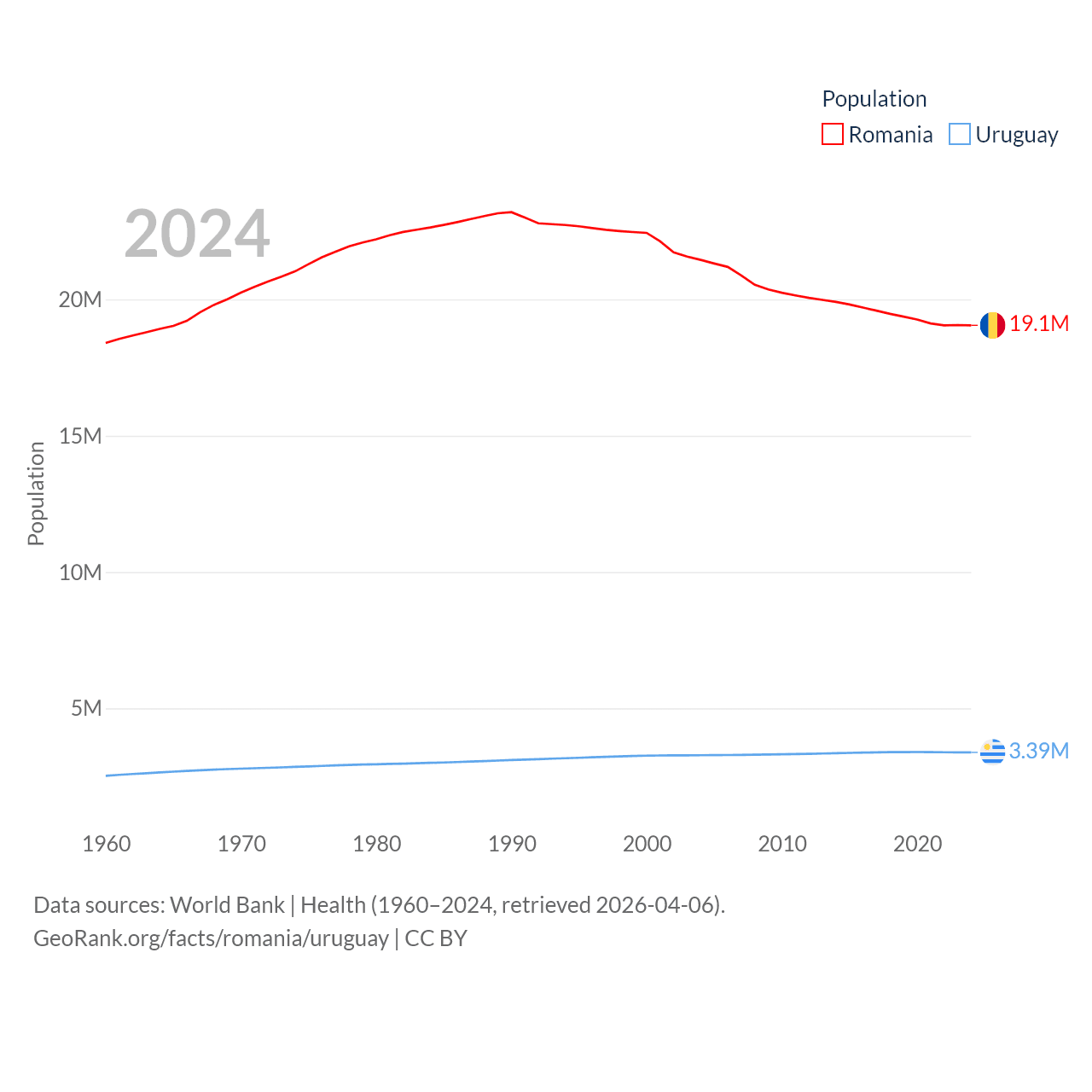 Romania has a population of 19.1M (ranked 67/197), compared with 3.39M in Uruguay (ranked 133/197). Romania's land area is 88,834 sq mi versus 67,576 sq mi for Uruguay (ranked 80th vs. 89th).