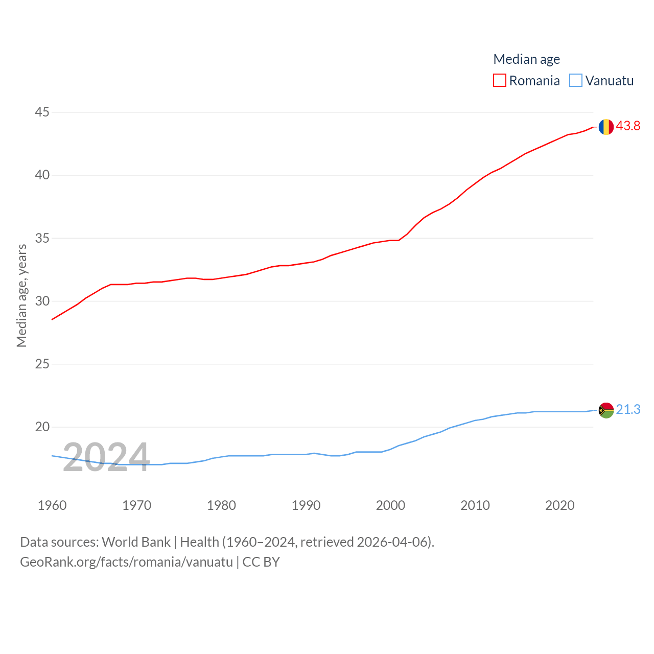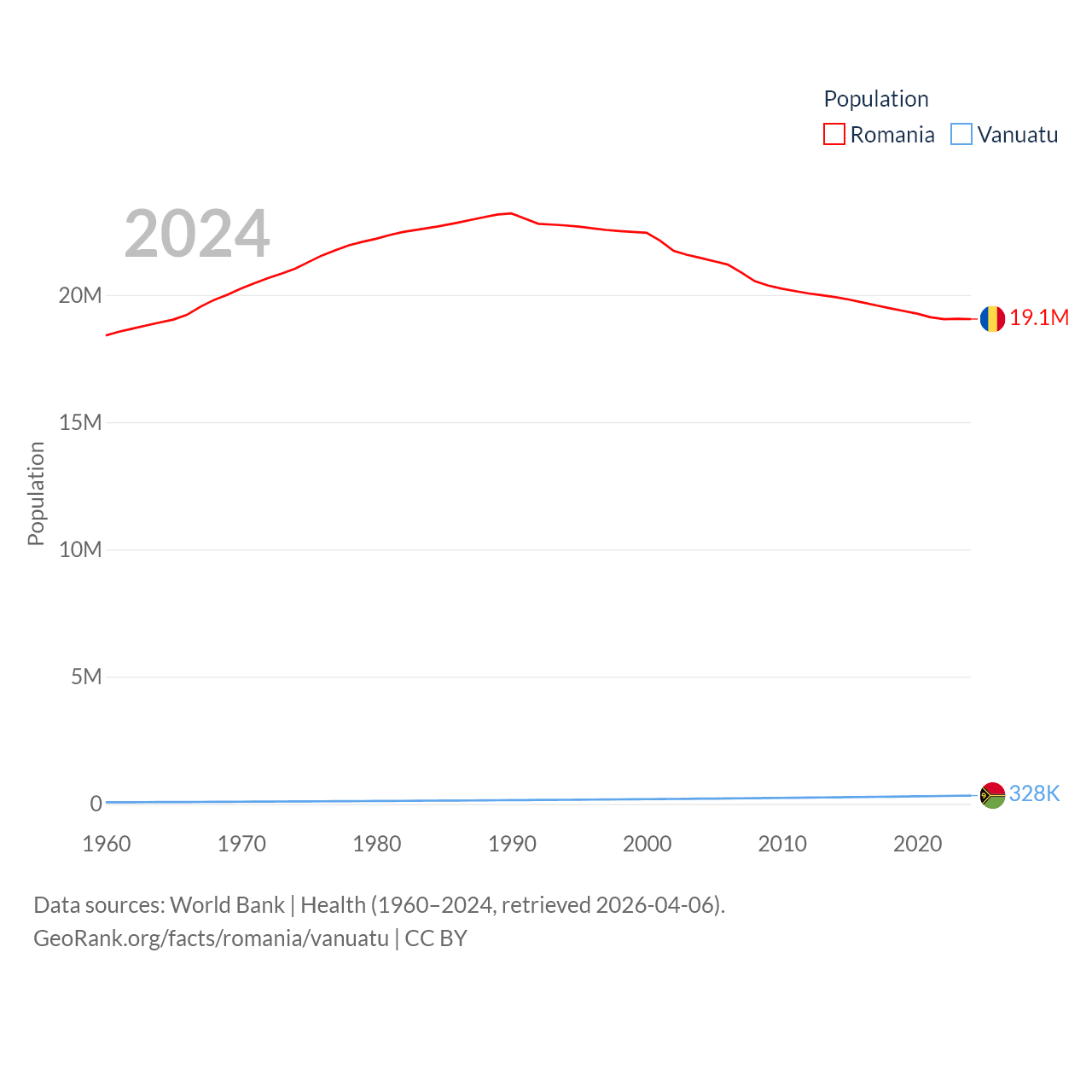 Romania has a population of 19.1M (ranked 67/197), compared with 328K in Vanuatu (ranked 174/197). Romania's land area is 88,834 sq mi versus 4,707 sq mi for Vanuatu (ranked 80th vs. 157th).