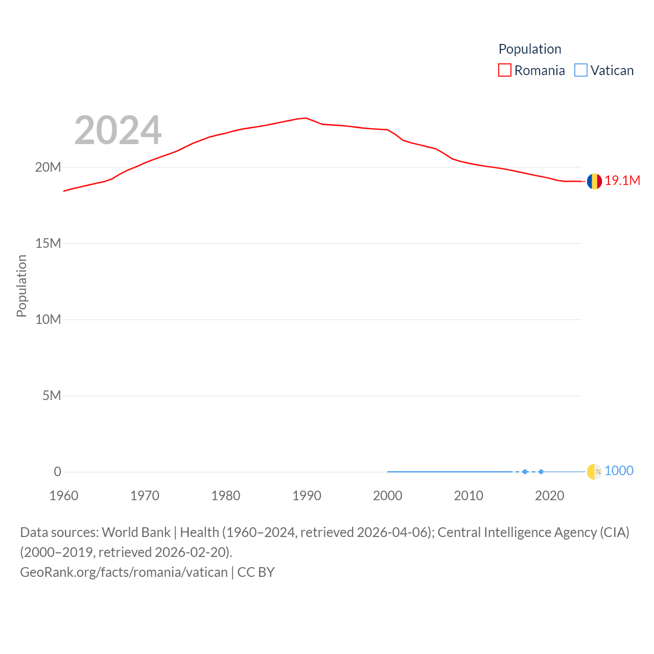 Romania has a population of 19.1M (ranked 67/197), compared with 1K in The Vatican (ranked 197/197). Romania's land area is 88,834 sq mi versus 0.17 sq mi for The Vatican (ranked 80th vs. 197th).