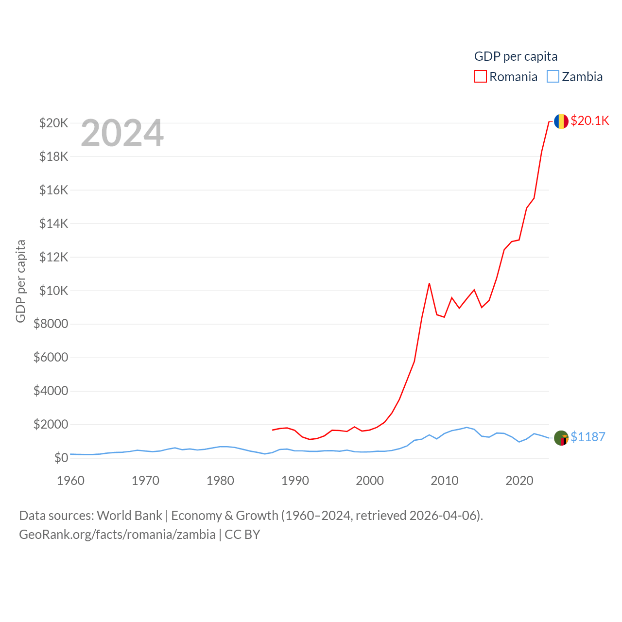 By GDP, Romania ranks 42/197 ($383B) and Zambia ranks 116/197 ($25.3B). By GDP per capita, Romania ranks 58/197 ($20,080), while Zambia ranks 169/197 ($1,187).