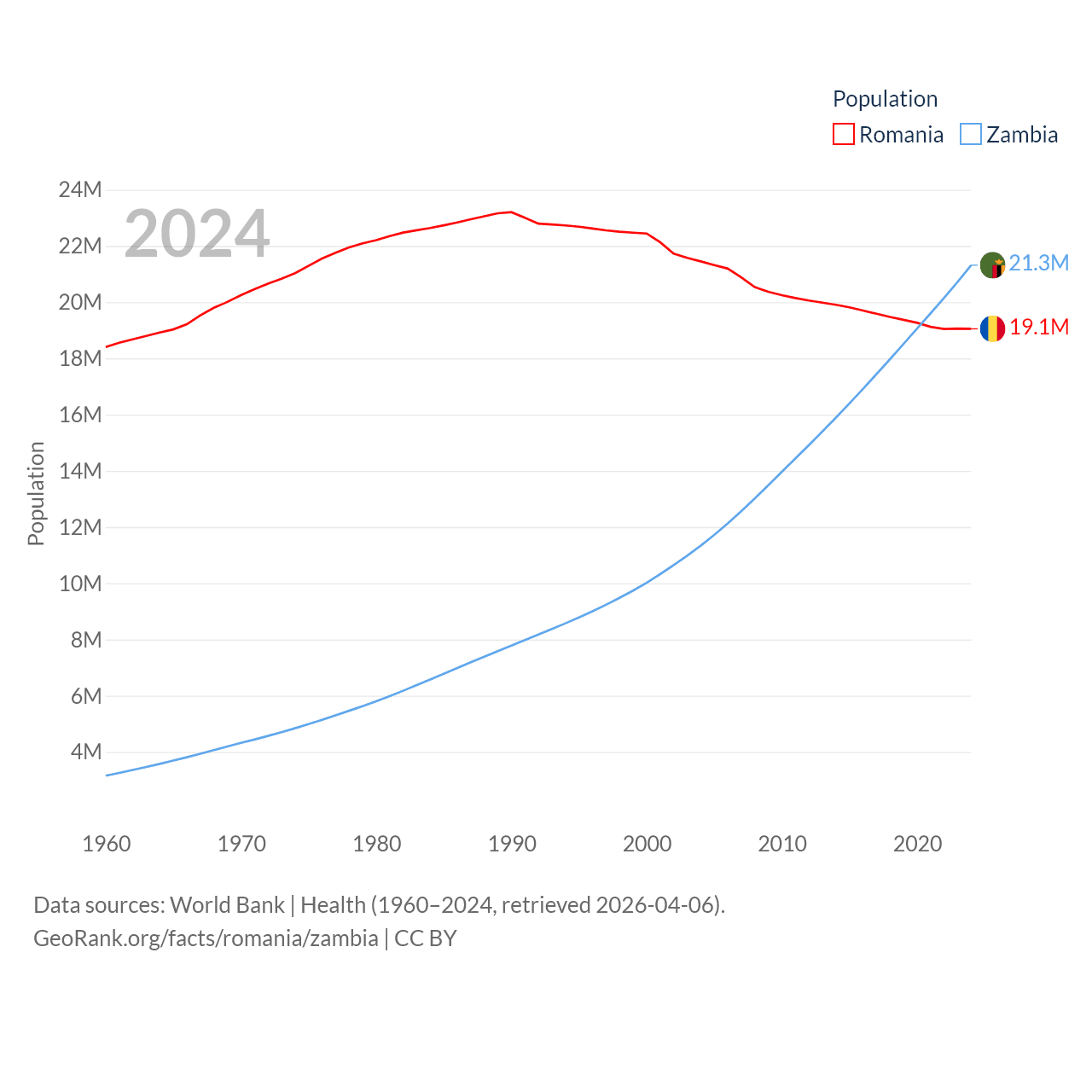 Romania has a population of 19.1M (ranked 67/197), compared with 21.3M in Zambia (ranked 63/197). Romania's land area is 88,834 sq mi versus 287,024 sq mi for Zambia (ranked 80th vs. 37th).