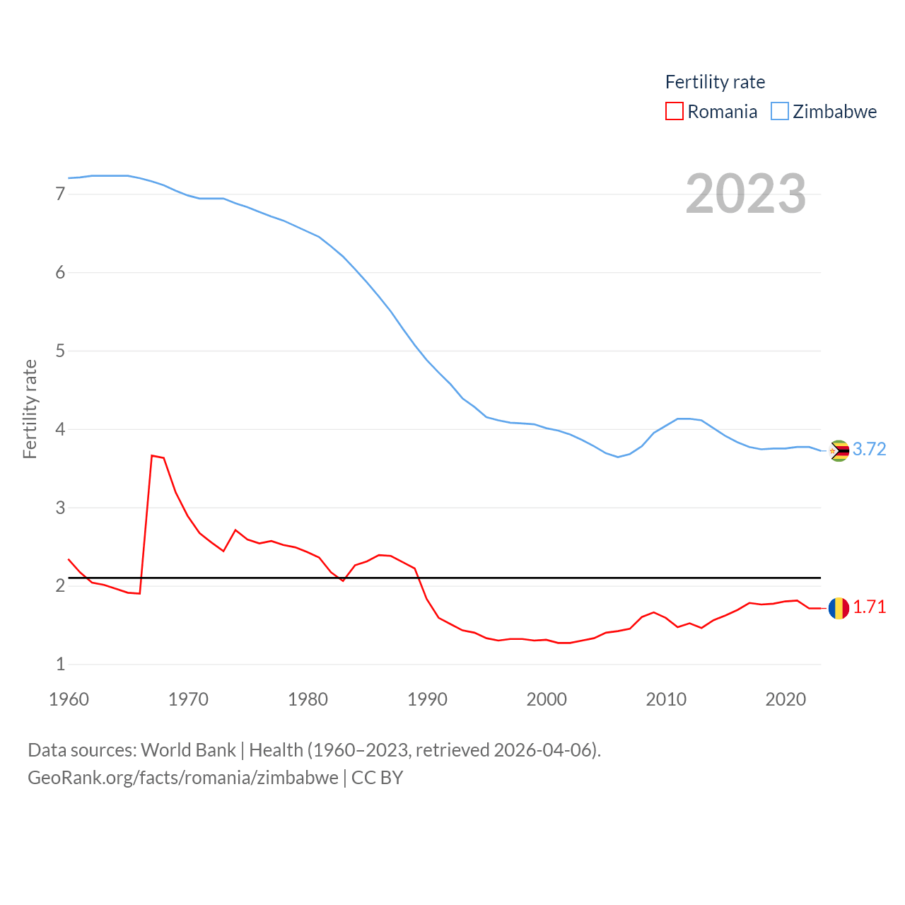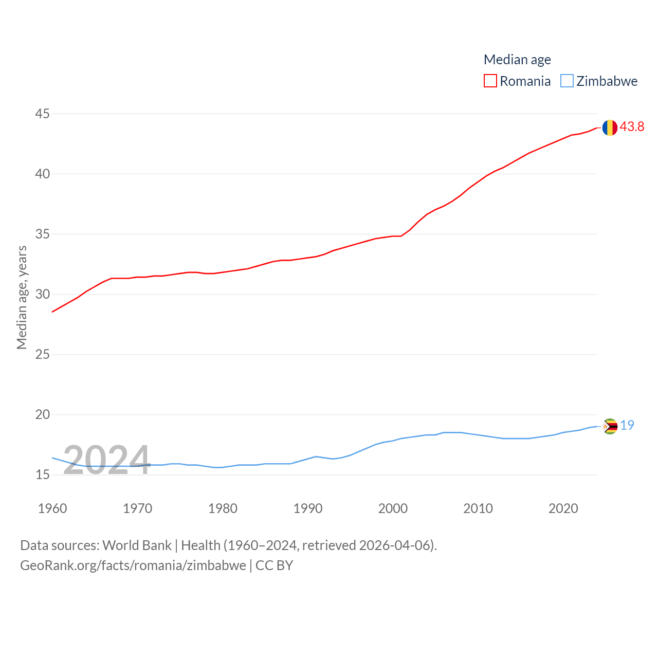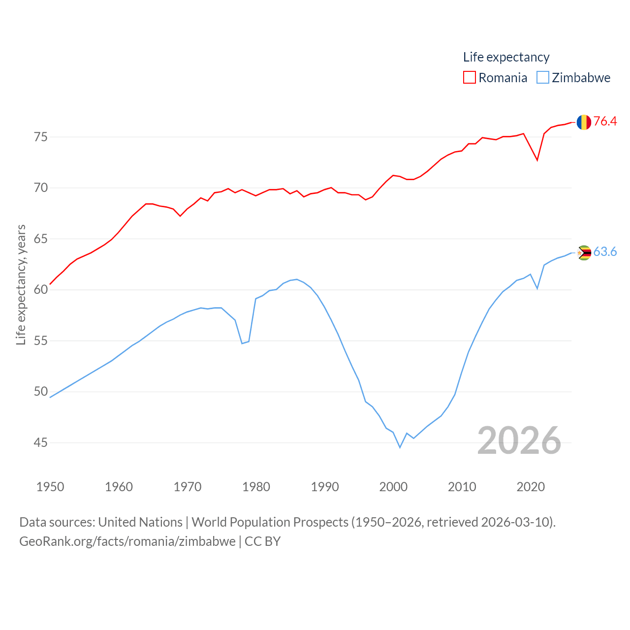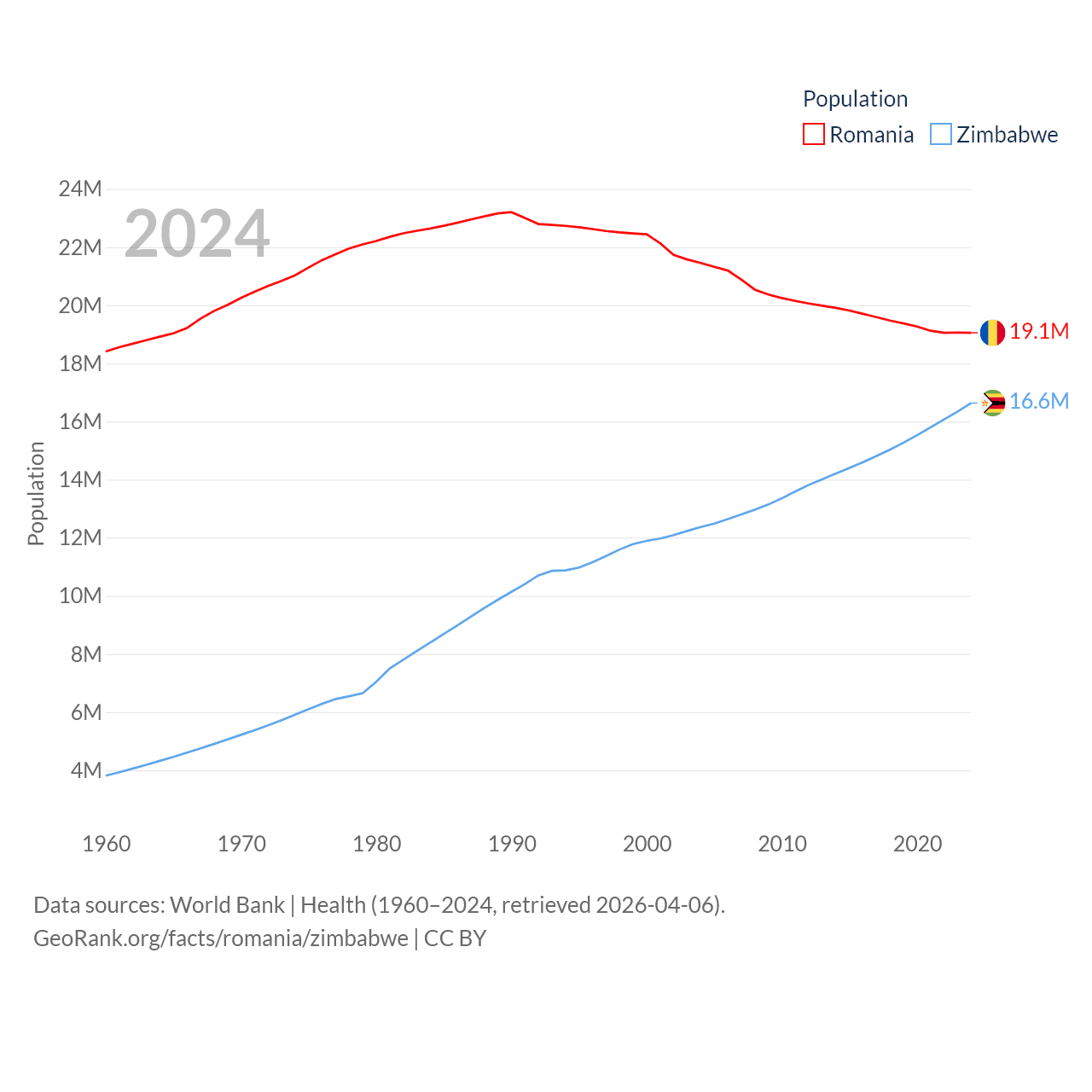 Romania has a population of 19.1M (ranked 67/197), compared with 16.6M in Zimbabwe (ranked 74/197). Romania's land area is 88,834 sq mi versus 149,364 sq mi for Zimbabwe (ranked 80th vs. 60th).
